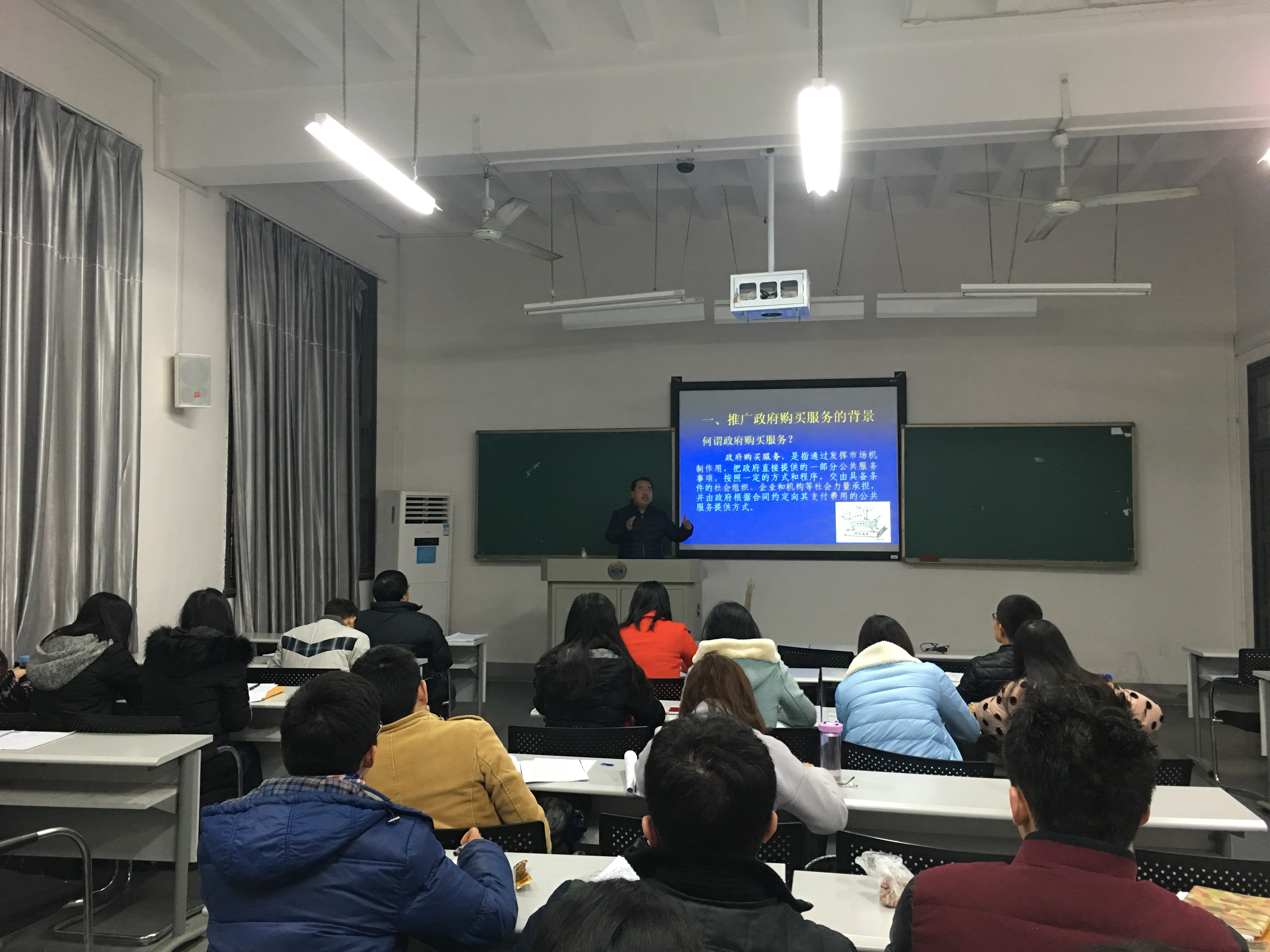讲座中,汪处长结合自身调研事例,运用生动的语言由浅入深为大家层层讲解政府购买社会服务政策的内涵。深刻实用的讲座使同学们受益匪浅,有关创新政府购买的途径引人深思,同学们均表示受益良多,并纷纷提问。最后,陈晓春教授对此次讲座发表了高度评价,讲座在同学们的热烈掌声中圆满结束!