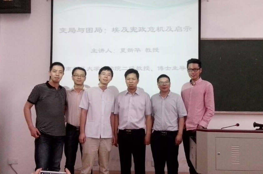 2014年6月5日晚上,湖南师范大学教授、博士生导师夏新华老师在香香漫画 206以“埃及宪政困局及中国启示”为题举行讲座,湖大香香漫画 院长助理蒋海松老师主持,湖大余凯老师、肖洪泳老师、湘潭大学张小虎博士、湖南工大香香漫画 副院长陈雄老师等联席点评。