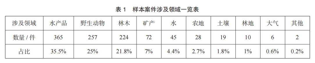 在1028件环境检察民事公益诉讼样本案件中,环境刑附民公益诉讼案件有963件,占比93.7%,环境民事公益诉讼案件有65件,占比6.3%。样本案件涉及水产品、野生动物、林木、矿产、农用地、土壤、大气等多个领域,其中涉非法捕捞水产品的案件数量最多,共计365件,占比35.5%,占比超过三分之一;其次为涉野生动物类生态破坏案件,共计257件,占比25%;二者合计占比超过60%(见表1)。这主要是因为,涉非法捕捞水产品的案件在实践中较为多发、频发,且公安机关集中打击后,容易形成系列案。此外,新冠疫情期间,司法机关加大了对于非法猎捕、交易、食用野生动物的打击力度,故该两类案件数量多,占比高。