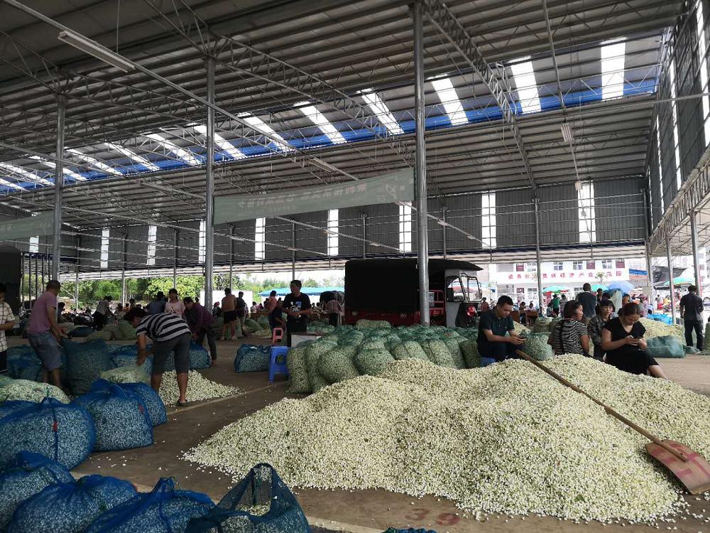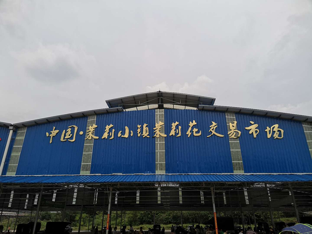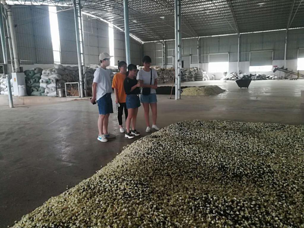 在结束长海茶厂的参观以后,实践团队一行又来到位于横县校椅石井村的“中国·茉莉小镇”茉莉花交易市场。在市场内,队员们看到了花农与花商们之间来来往往的交易,通过与之交谈,大家了解到每天于市场内交易的花农可达上万人。今年受疫情影响,7月来平均每天的茉莉花成交量达100吨,单价约15元每千克,成交额约150万元。