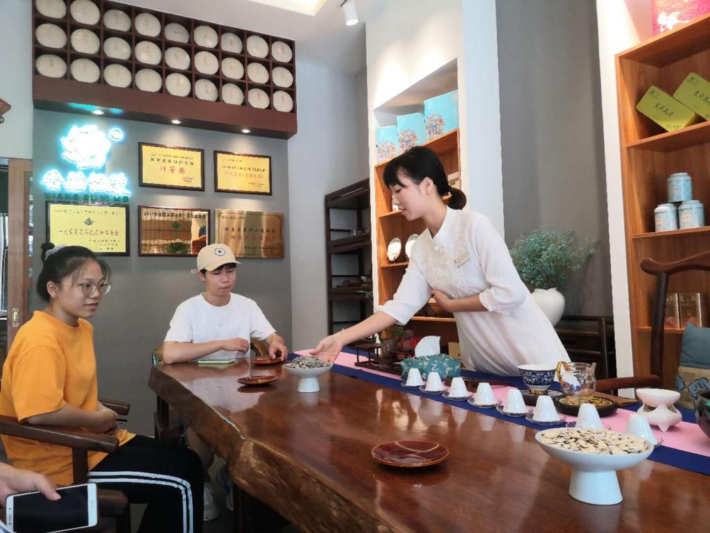 作为广西第一个农村淘宝示范县,近年来,横县积极利用“互联网+”思维发展茉莉花和茉莉花茶产业,不断优化电商发展环境,着力从产业培育、技术支撑、创业孵化、金融支持、人才引进等方面打造多元化的电商服务体系。在交流中,实践团队一行也了解到长海茶厂也正在利用这一新的机遇积极转型、发展一系列自营品牌。讲解人员介绍,该茶厂于2019年开拓电商平台渠道,目前公司品牌传播平台主要包括淘宝、京东、拼多多、抖音、1688等,团队也从最初的七八人发展壮大至如今的四五十人。今年年初新冠疫情的爆发阻挡了人们出行的步伐,带动了网络购物的兴起。长海茶厂的工作人员也借此机会,通过直播带货的形式进行自身产品的推广,今年“618”活动最火爆的时候,日均可接到几千甚至上万份订单,前景十分可观。通过电商平台,茉莉花可以销售到全国各地甚至世界各地,这不仅促进了茉莉花产品的销售,也有助于提高横县茉莉花产业在各地的知名度。同时,讲解员提到,横县在茉莉花与电商产业发展过程中十分注重人才培养,非常欢迎与支持优秀毕业大学生回到家乡贡献出自己的一份力量。