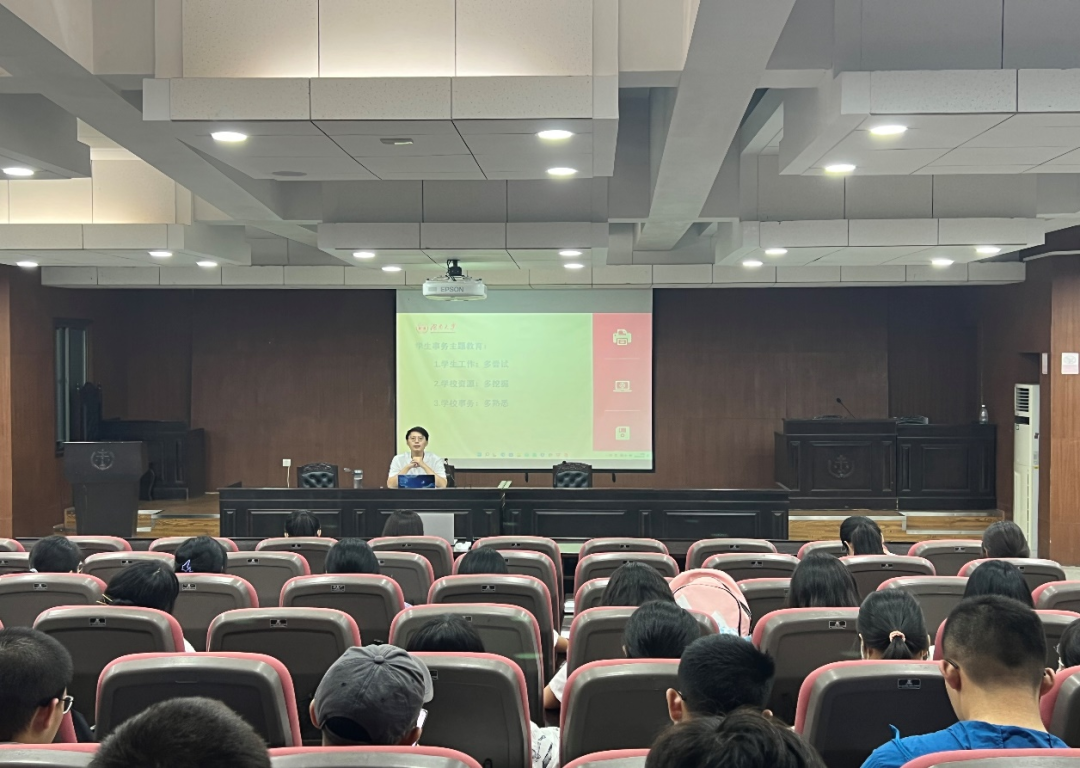 于模拟法庭召开2022级本科新生校纪校规及学生事务主题教育活动。本次主题教育由辅导员曹晓军老师主讲,全体本科新生参加。
