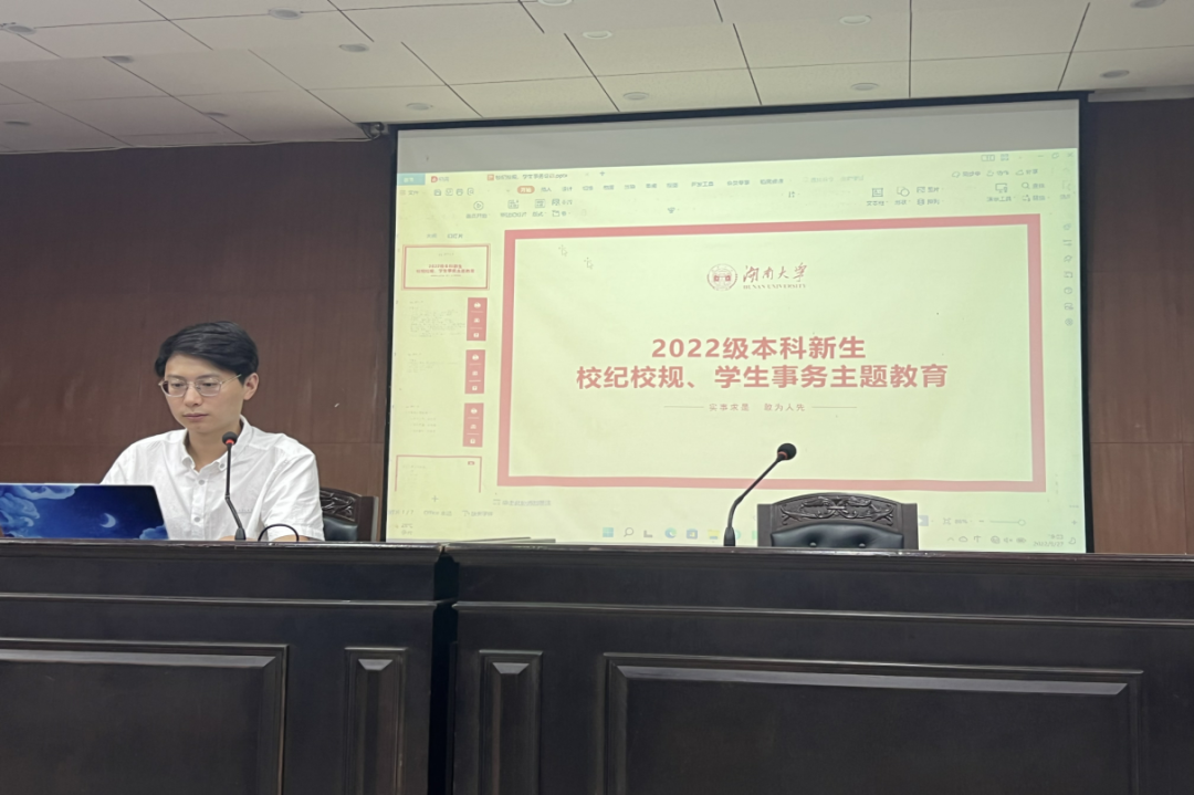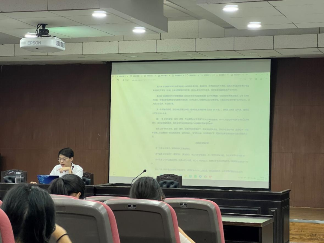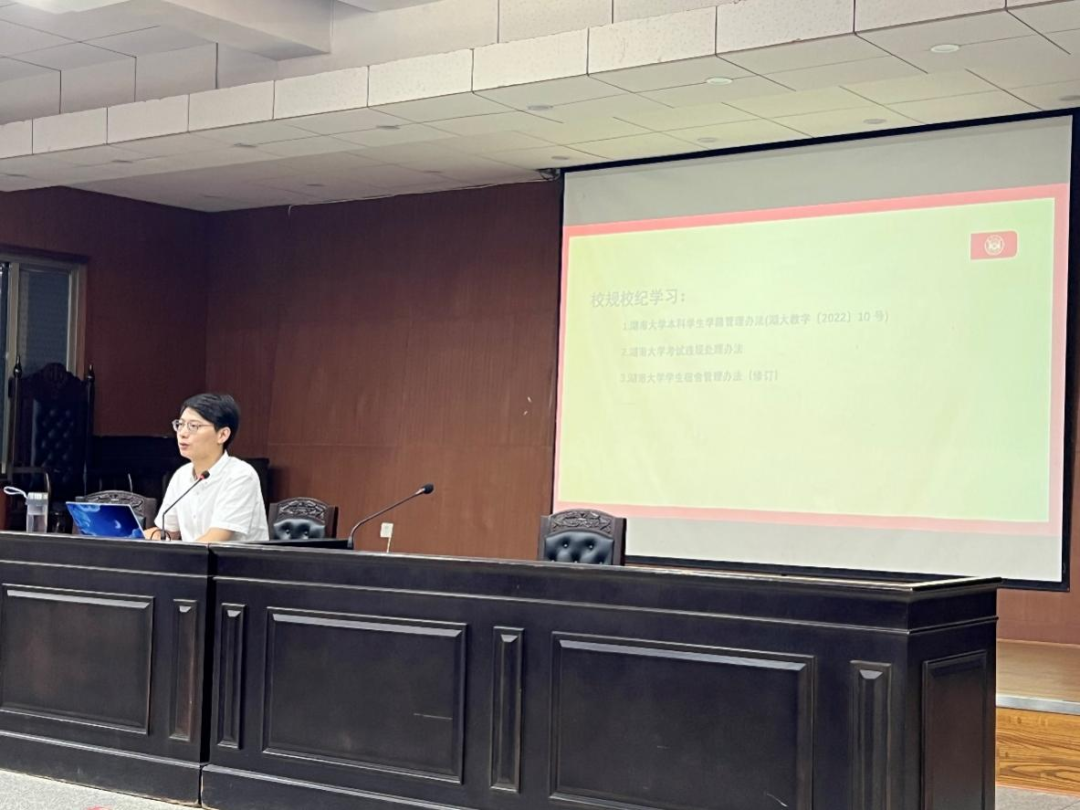 学生宿舍管理办法(修订)》等学校规章制度逐一解读,条分缕析,逻辑严明,并对个别条例做出了详细的解释,尤其对新生最容易违反的条例进行了着重强调,让同学们对湖大校纪校规有了更深刻的认识,真正感悟到了校纪严明学风端正的湖大风采。
