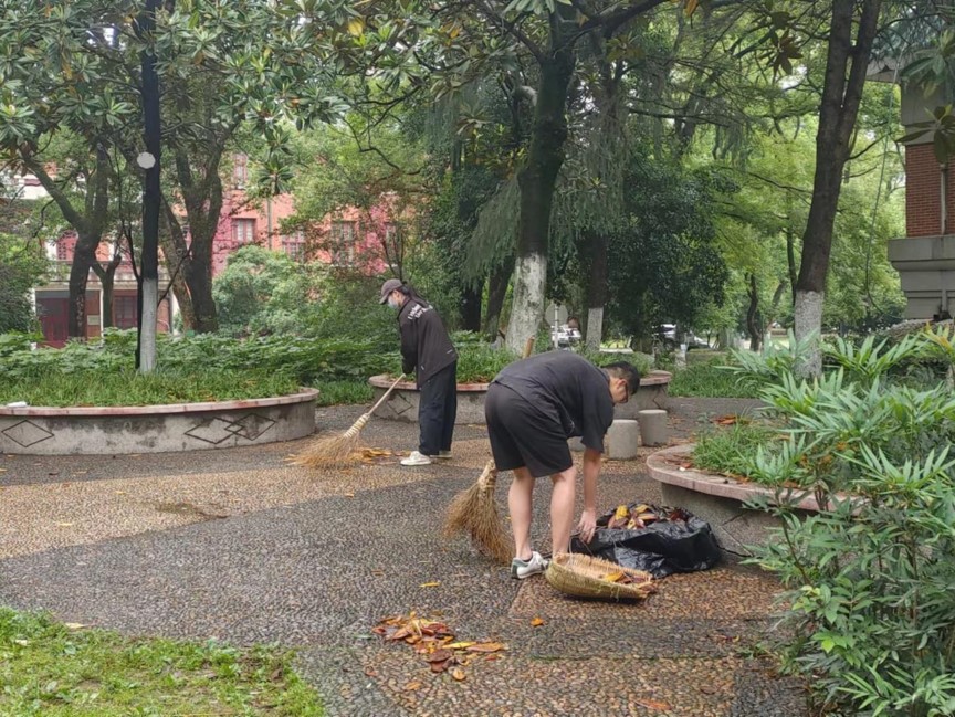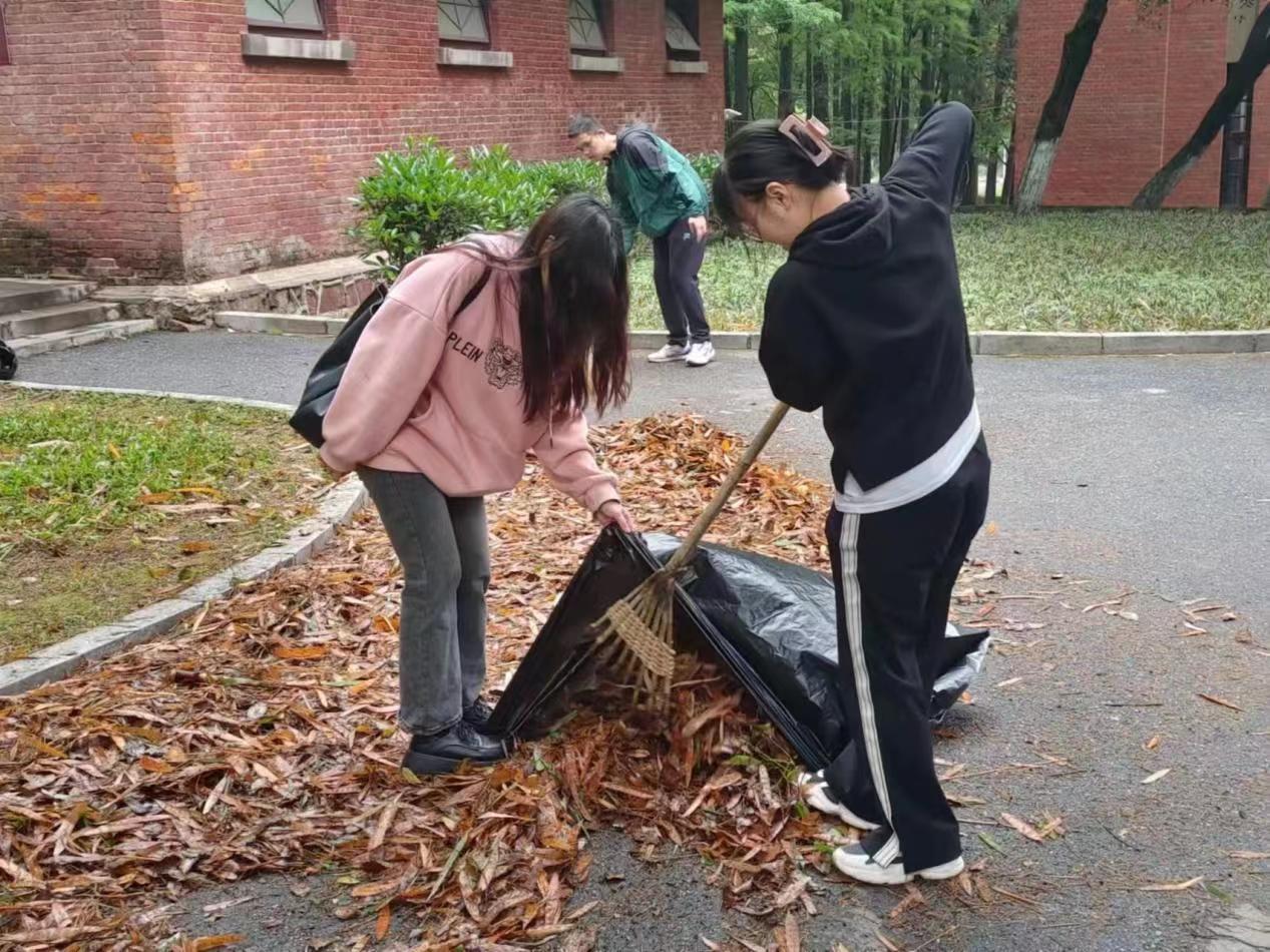 同学们被分配到工具后就各自寻找小组和划分区域开始打扫。一部分同学利用耙子将枯枝落叶从绿化带中清理出来,另一部分同学将枯枝落叶清理到垃圾袋中,在彼此的配合下,大礼堂周边终于清理干净。