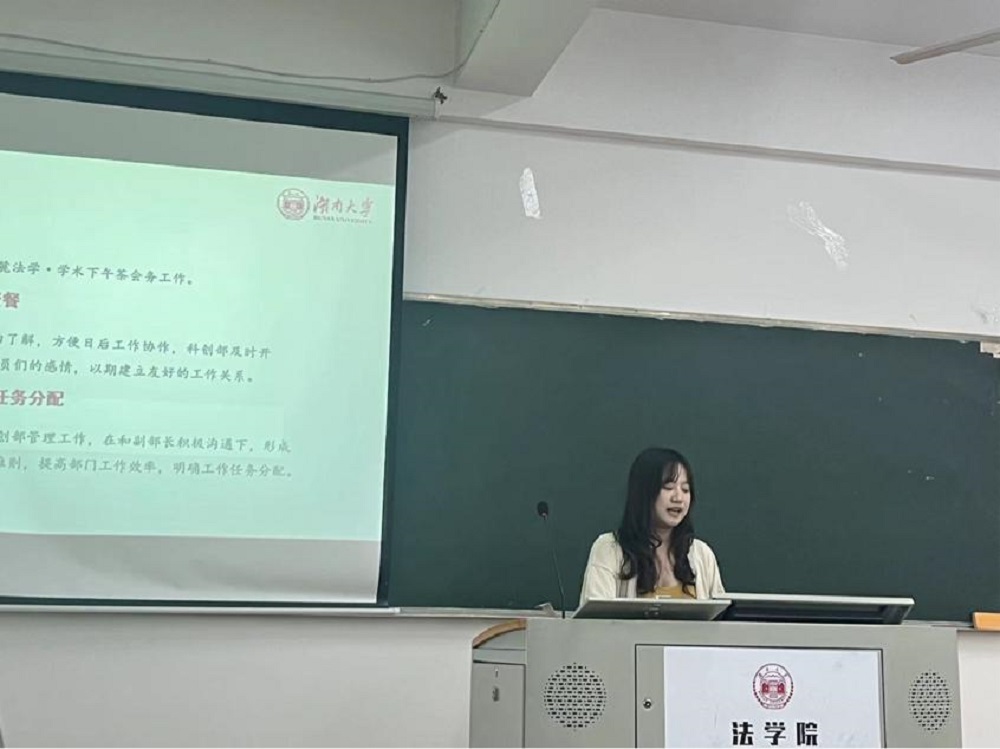 接下来,刘岳峰老师发表了致辞,对研究生会的各位同学提出了以下几点期望。第一,不忘初心,希望各位同学不要忘记加入研会的初衷,在面临挫折和压力时,保持对工作的热心、热情、和热爱。在服务同学的过程中,锻炼自己的能力,提升自己的素养。着重培养写作能力,加强沟通能力,处理好学习和工作的关系。第二,各部门内部加强团建,各部门之间加强协作。各部门工作例会、工作研讨会、工作总结会要定期开展,提高研究生会工作效率和质量。第三,希望各位干事和干部能做到在其位谋其政,结合自己部门的特色,对于自己部门发展、工作开展提出自己的想法,为研究生会的建设贡献自己的力量。