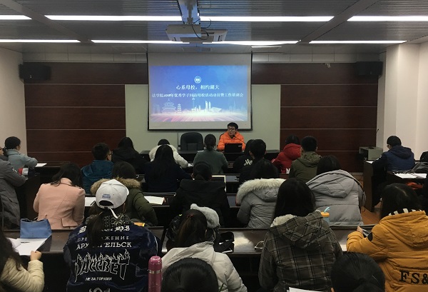 ,让更多的同学了解湖大,关注湖大,进而努力报考湖大,进一步巩固与提升湖大品牌,拓展生源市场,提高生源质量。二是希望各位同学回到母校,通过回访这样一种形式与老师们保持沟通,联络感情,感恩母校”。杨老师从学校招生宣传和学生思想教育育人两个方面向同学们介绍了本次活动的目的,并就2018年回访母校活动的具体要求和注意事项进行了详细的讲解,具体包括了活动开展的前期准备、开展中的注意事项以及活动后的报告撰写等方面
