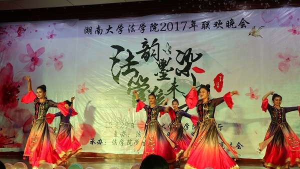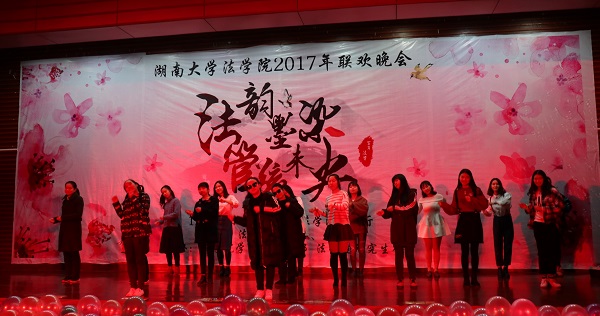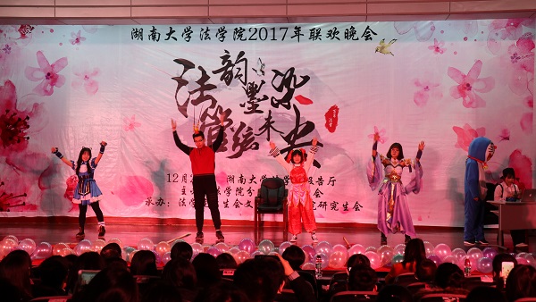 赫曦映岳麓山,青春跃星城,17级行管一班全体同学模仿高中时代的校园电视台,为观众们奉上了活力四射的舞蹈《悦动青春》,瞬间点燃了场内气氛。17级法学三班孙鹏翔、陈佳、马若琳等同学主演的舞台剧《法三的秘密》用cosplay的方式演绎流行游戏,精彩的表演为观众们带来了阵阵欢笑。情牵法韵,流年似水,17级法学四班的歌舞节目《四水年华》用华美的舞蹈与动听的音乐和观众们一同追忆似水年华、展望美好未来。有一种故事叫做爱情,有一种流行叫做穿越,17级行管二班苏哲豪、胡鑫雅等同学主演的话剧《假如爱有天意》将二者完美结合,描绘了一场唯美而有趣的爱情故事。