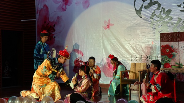 身着民族服装的少数民族同学们走下舞台后,晚会进入了第二个互动环节——“蒙面猜歌王”。十首歌曲,听音乐猜歌名,现场的观众们各出奇招,或挥舞手中的道具,或展示自己的才华,吸引着主持人的注意。在李永罗、钱娅两位主持人的带动下,现场笑料不断,晚会气氛也渐渐走入新的高潮。互动环节结束后,在主持人风趣的对话中,赵高鹿、黎曙光、贺俊峰三位研究生同学走上舞台,为观众们带来歌曲串烧《追光岁月》,动人的歌喉和精彩的吉他伴奏大受好评,更是赢得了不少观众的掌声与尖叫声。随后,由17级法学五班的同学们表演的小品《后宫张嬛传》为现场带来了阵阵欢笑,张子政、谷雨两位同学的反串出演,精湛的演技配合恰到好处的包袱,古灵精怪的对白和出人意料的剧情,令观众们捧腹大笑,拍手称赞,尤其是两位同学滑稽的舞蹈动作,令人印象深刻。