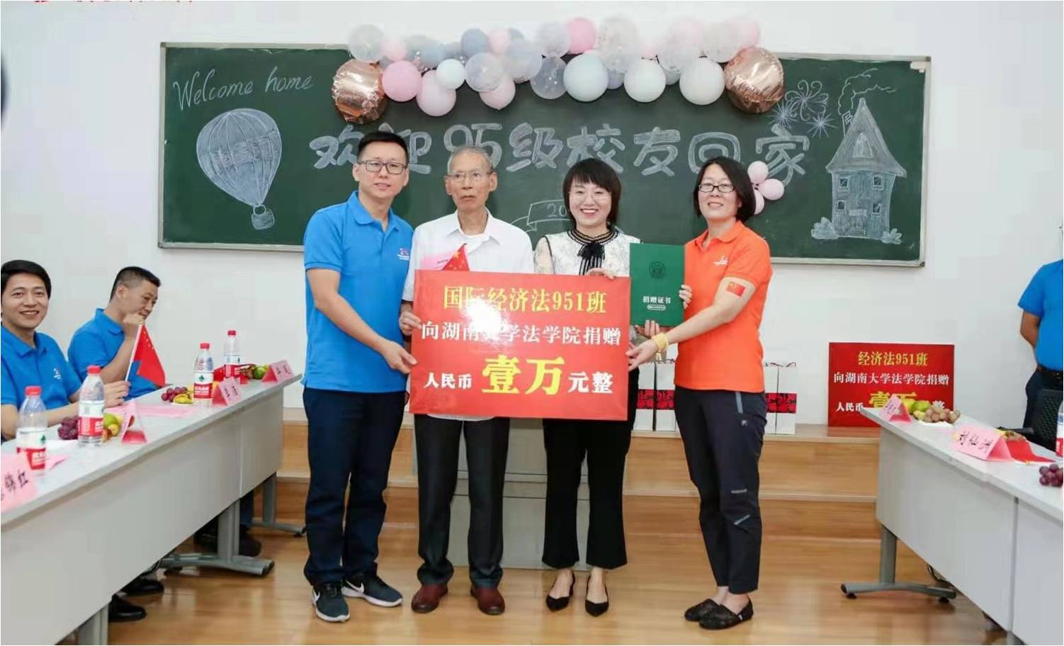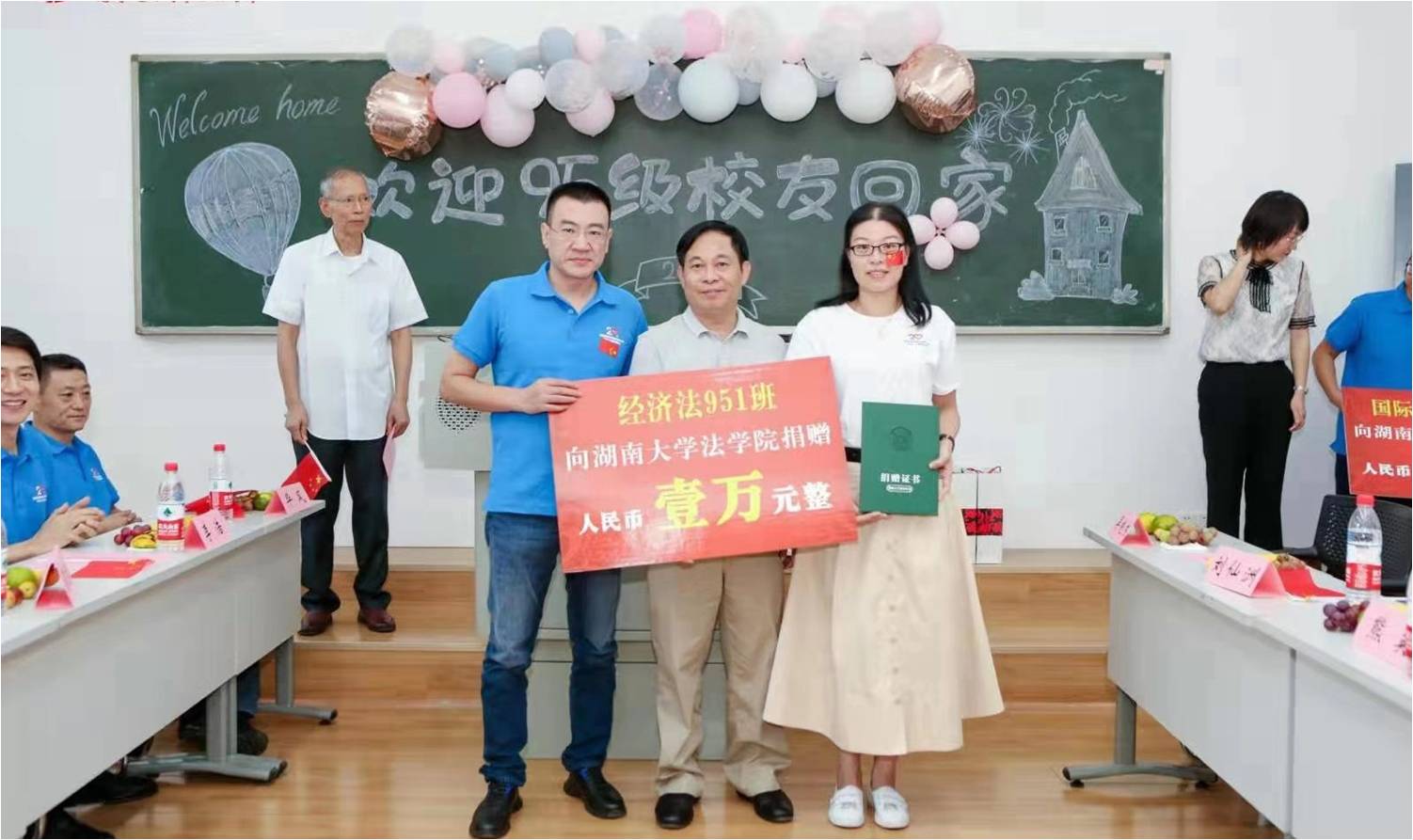10月3日,在95级校友回访座谈会上,国际经济法951班和国际法951班校友代表分别向母校捐资一万元,并赠与老师们礼品,抒发自己的赤子情怀和母校情结,感恩母校当年栽培之意。易骆之老师、罗英老师、候孝华老师代表学院接受校友捐赠,同时代表学院回馈以证书和寓意“书写更加精彩的人生华章”的毛笔礼品,祝福他们事业有成,家庭幸福。