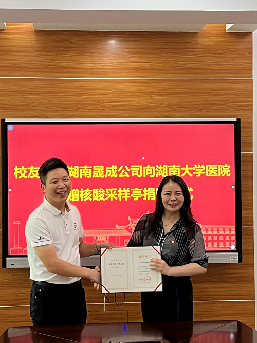 首先,我校2001级工业设计专业校友、湖南晟成公司董事长唐少华先生发表了热情洋溢的致辞,表达了自己对母校深厚的感情,对白衣天使无比地敬佩,并讲述了自己的创业经历,介绍了企业的经营状况和本次捐赠的核酸采样亭的功能和特点。