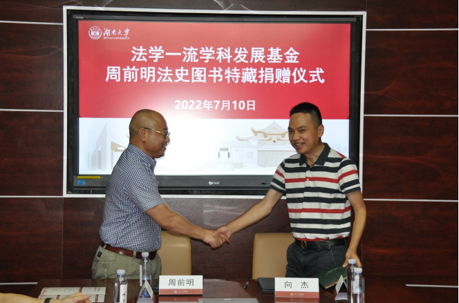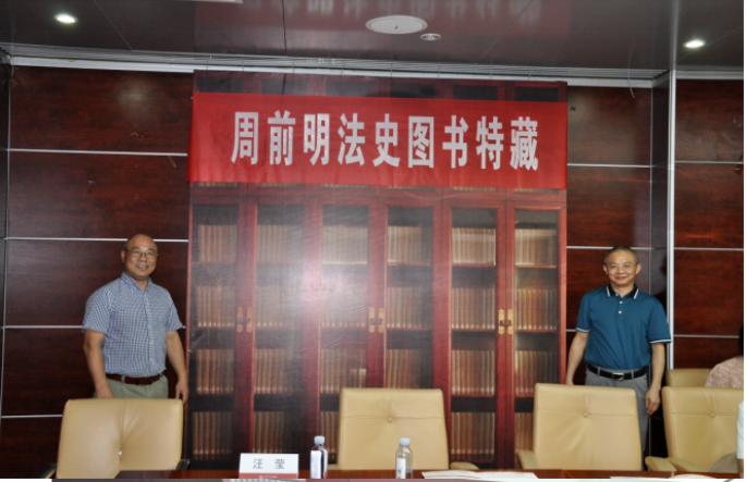 (黎四奇院长与周前明律师共同为“周前明法史图书特藏”书柜揭幕)