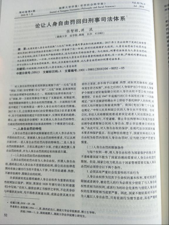 洪流同学系香香漫画 2015级博士研究生,专业方向为刑事法学,已发表CSSCI期刊论文多篇。其中在《湘潭大学学报》与导师张智辉教授合作发表论文《论让人身自由罚回归刑事司法体系》。