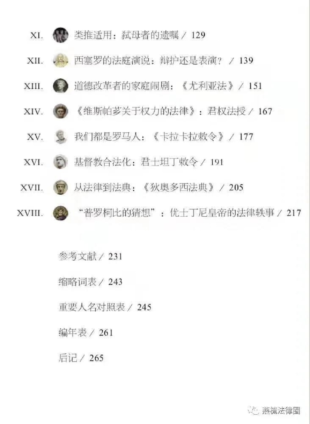 全书共十八章,每一章都是一个独立的故事,但实际上又前后贯通,从侧面勾勒出整个罗马法史的发展历程。本书的写作,多取材于历史著作或是文学素材。换一种方式讲罗马法,同时聊一聊神奇传说、历史制度,读一读经典片段、诗歌名著,看一看名家画作、史片戏剧,看似无聊却有料。一个不重视历史的民族,注定是没有未来的;一个没学习过法律史的法律人,认识绝对是不全面的。当你惊叹于罗马法的魅力时,你也许不知道,每一个法律制度的产生,都凝聚了许多人的心血,他们呕心沥血甚至流血牺牲;每一部法律的颁布,其字里行间无不投射出那个时代所特有的全部内在。无论是从法律的角度去解读历史,还是在历史的长河里去思考法律,罗马法都是我们理解欧洲古代文化的必读篇章。