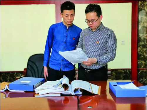 胡鹏(右)和同事正在学习政策文件