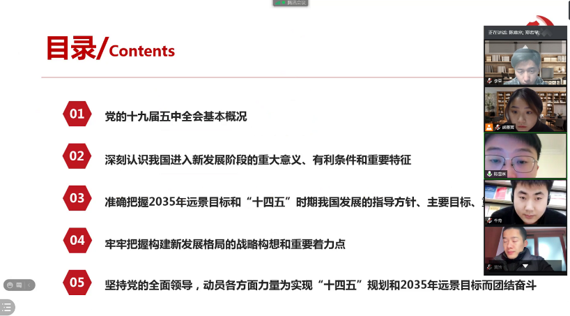 陈章京同志播放ppt,并向大家介绍了十九届五中全会的详细内容。十九届五中全会审议通过《中共中央关于制定国民经济和社会发展第十四个五年规划和二〇三五年远景目标的建议》,明确提出“十四五”时期我国发展的指导方针、主要目标、重点任务、重大举措,集中回答新形势下实现什么样的发展、如何实现发展等重大问题,是今后5年乃至更长时期我国经济社会发展的行动指南。会议首提一系列战略性创新性举措,并强调民生改善和科技自立自强。同时,会议指出重要战略机遇期内涵发生变化。党的十六大就作出我国处于重要战略机遇期判断。近20年过去了,十九届五中全会作出全新重要判断,即当前和今后一个时期,我国发展仍然处于重要战略机遇期,但机遇和挑战都具有新的发展变化。