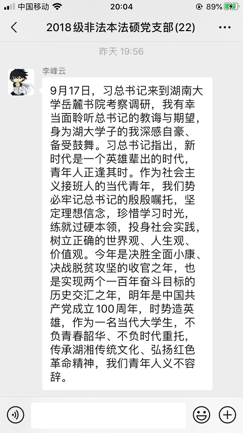 研究生2018级非法本法硕党支部组织支部同志认真学习总书记重要讲话精神,但因实习安排,不便组织线下学习活动,所以特在线上举行学习分享会。在学习分享会上,支部同志积极分享自己对总书记讲话精神的学习心得。以下是部分同学的心得分享: