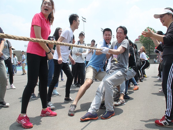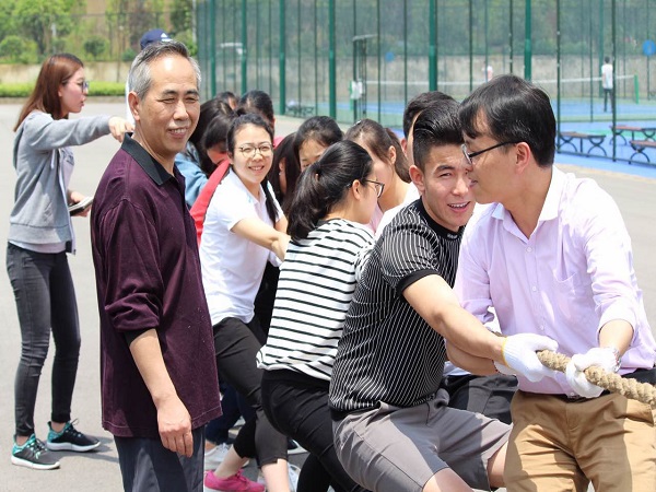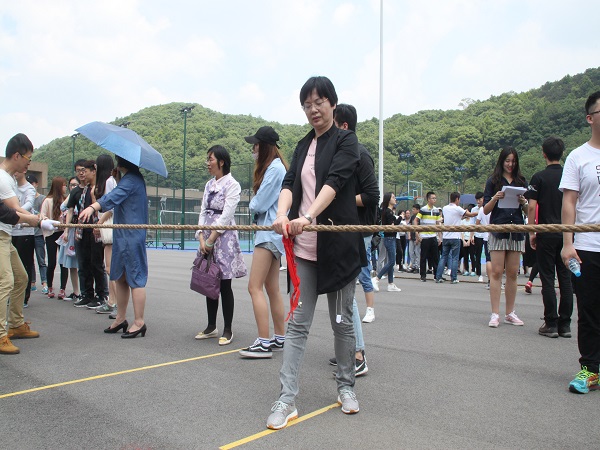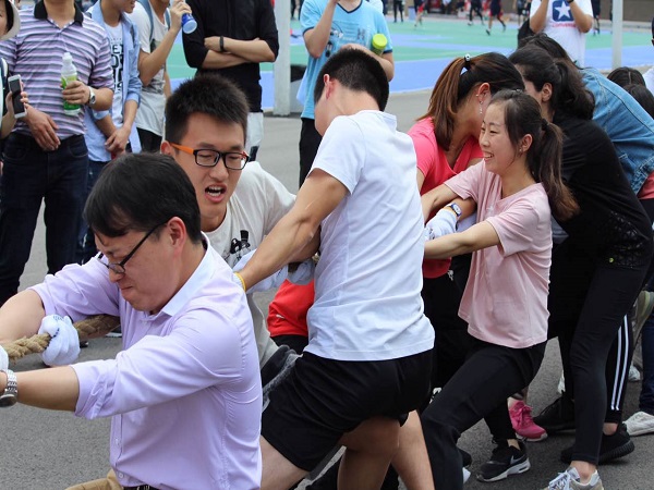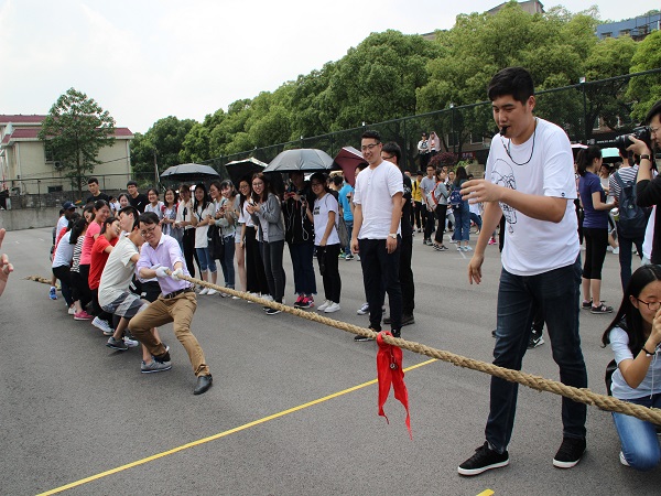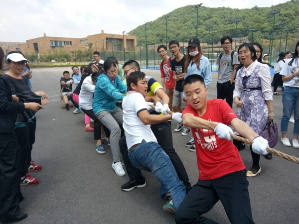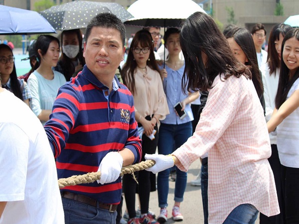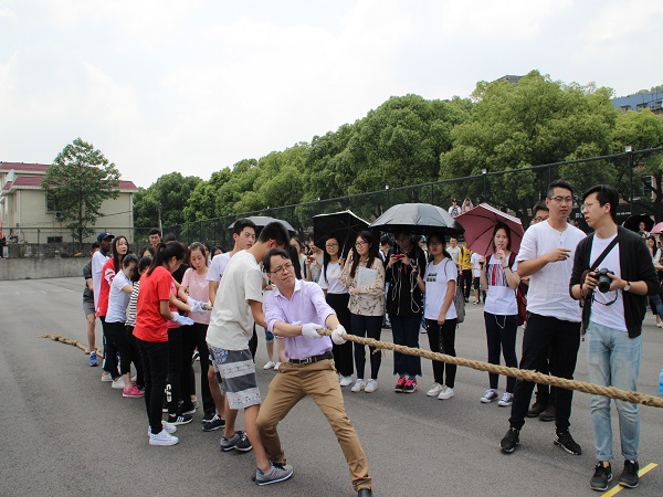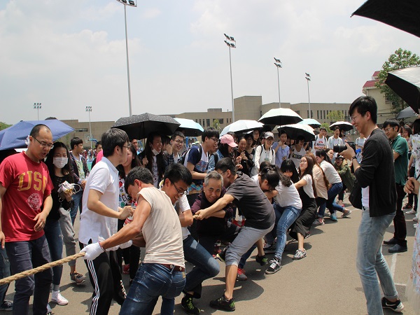第二届群众体育文化节开幕。参加本次拔河比赛的队伍共有14支,每个队伍中都有一至两位老师参与其中。