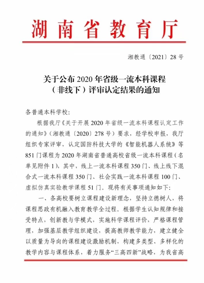 教学创新的重要成果,彰显了课程的影响力和创新性。学院将按照教育部、湖南省教育厅的要求,坚持立德树人根本任务,持续加强课程建设,着力打造具有高阶性、创新性和挑战度的“金课”,坚持以学生发展为中心,树立课程建设新理念,为教学改革做出新贡献。