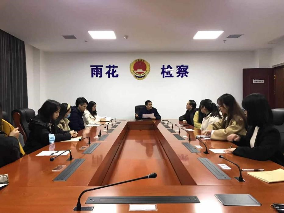 2021年3月8日上午十点,湖大实习团队在邓祥瑞老师的带领下来到长沙市雨花区人民检察院。长沙市雨花区人民检察院曾荣获“全国优秀检察院”称号,雨花区人民检察院党组成员、副检察长曾永清、政治部副主任刘雅对实习团队的到来表示热烈欢迎,并主持召开了见面会。