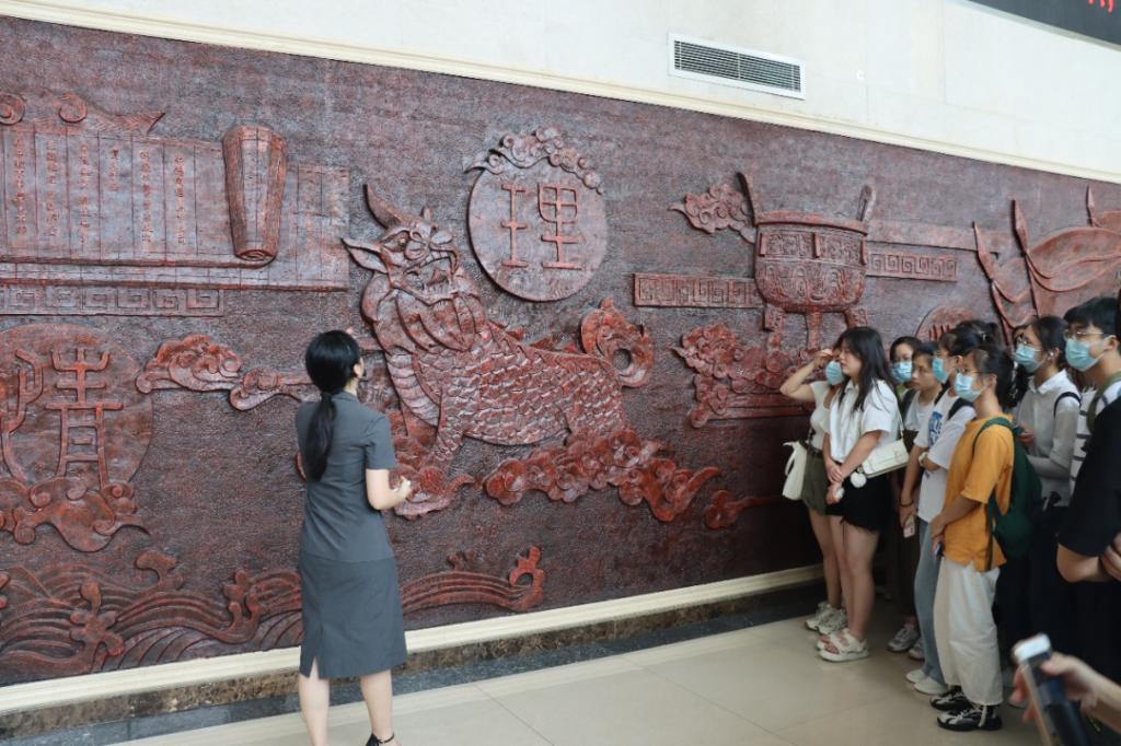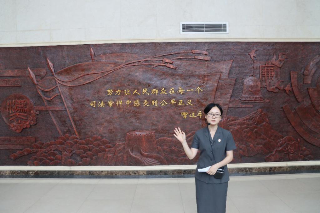 进入法院大门,映入眼帘的便是一面气势宏伟的法治文化墙。“努力让人民群众在每一个司法案件中感受到公平正义”两行金色的大字以飘扬的旗帜为背景,居于中央,格外亮眼。“这是习近平总书记在纪念宪法公布实施30周年大会上首次提出的工作目标,也是我们法院的工作指引。”法院工作人员叶嘉瑞、曾立祥为同学们介绍道。中国司法始祖皋陶,古代法治神兽獬豸,庄严的法徽和法律文本……在讲解人员细致的解说下,同学们对文化墙上种种法律元素所蕴含的深意有了更全面的认识,对于法院的庄严神圣也深有体悟。