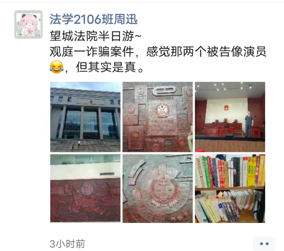 参观结束后,同学们跟随龙峰副主任来到高大庄严的审判庭,旁听了一起电信诈骗案件,见证了案件的审判流程。在案件的审判过程中,同学们不仅了解到了处处彰显着司法的公正的审判庭的构造,也在案件审判程序中不断思考、运用自身所学的知识,将知识和实践相结合,努力做到融会贯通,学以致用。这次案件的旁听也使同学们认识到自身专业知识的一些不足,激发了同学们的求知欲,引发了热烈的讨论。