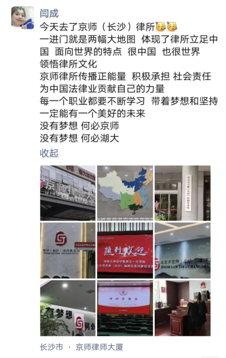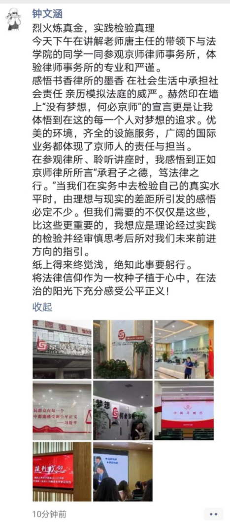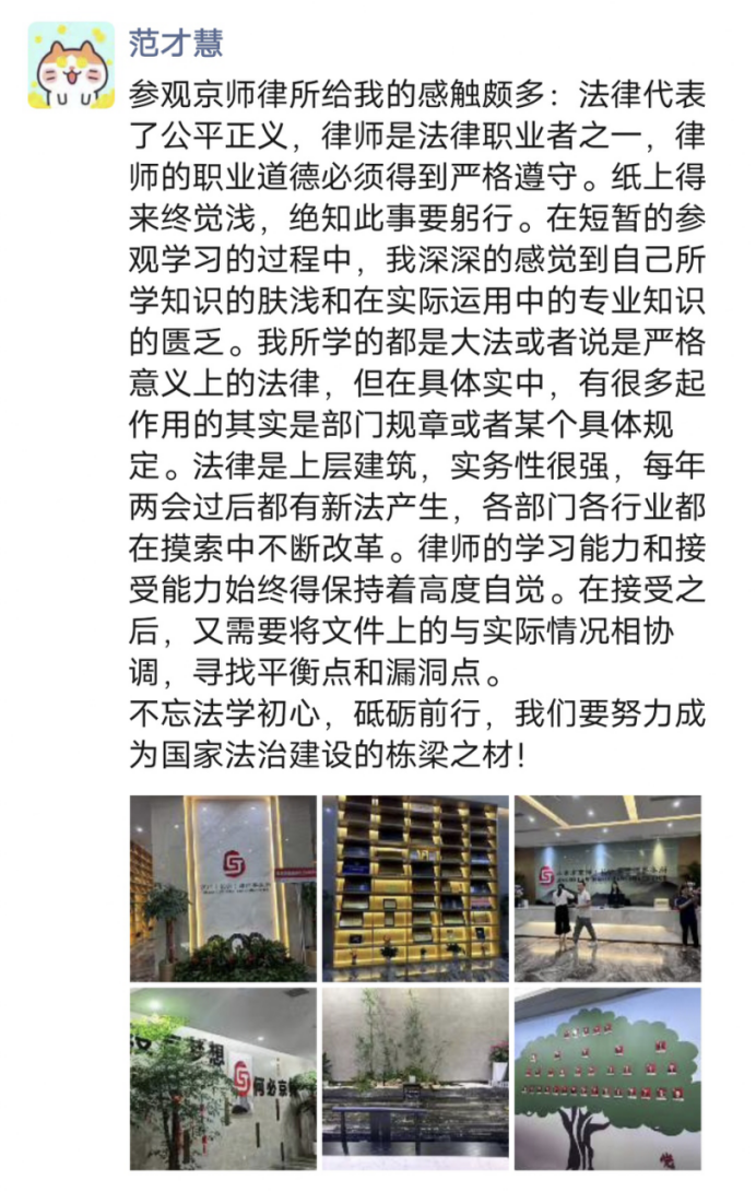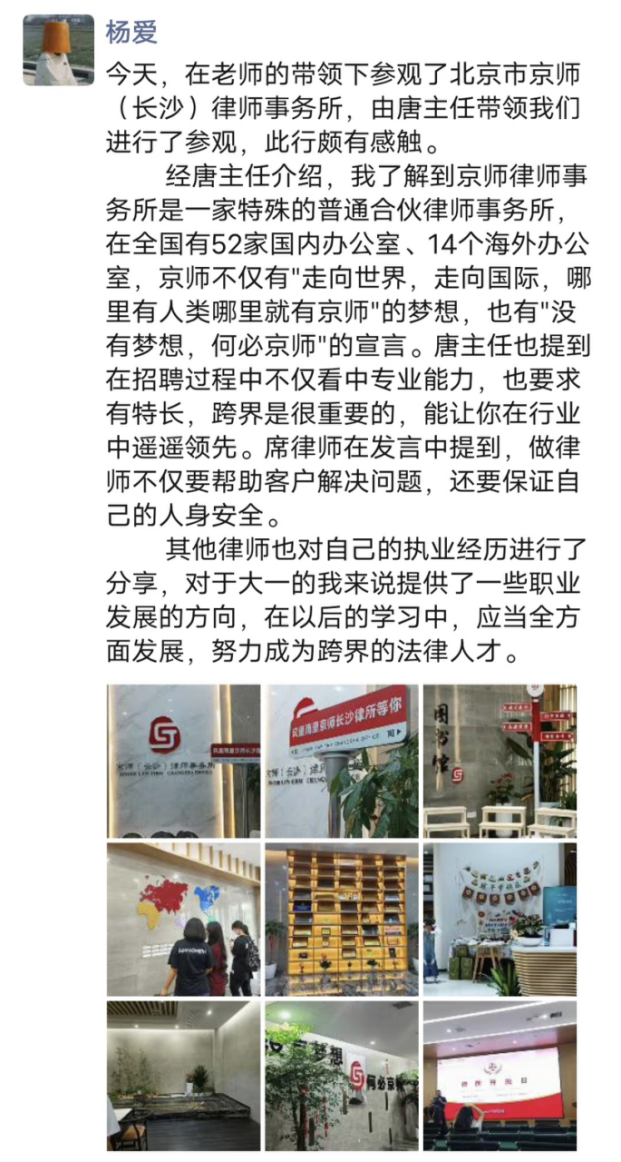 在两位律师的认真讲解之下,同学们了解到北京市京师(长沙)律师事务所(以下简称京师长沙),按照北京市京师律师事务所 2020 年第二阶段规模化发展要求,进驻长沙市设立分所。在长沙市雨花区时代阳光大道西 388 号,设立京师(长沙)律师事务所办公区域。京师长沙始终坚持总部发展理念,以“规模化、专业化、品牌化、国际化、电商化”为发展理念,实现京师长沙跨越式发展。在参观过程中,京师律所高质量和设备齐全的工作环境和同事之间和谐愉快的工作氛围打破了很多同学对律师这个职业的刻板印象,让同学们对这个职业产生了浓厚的兴趣。