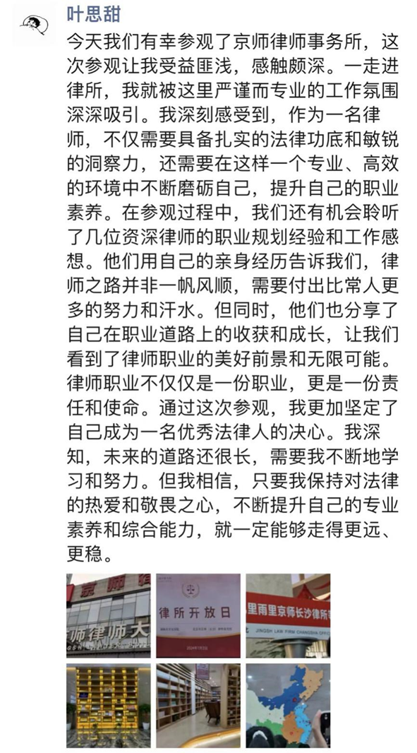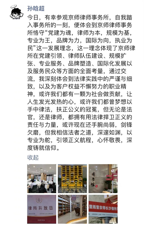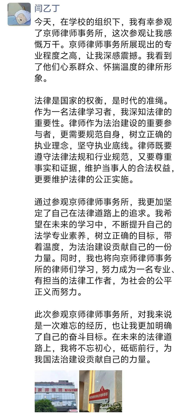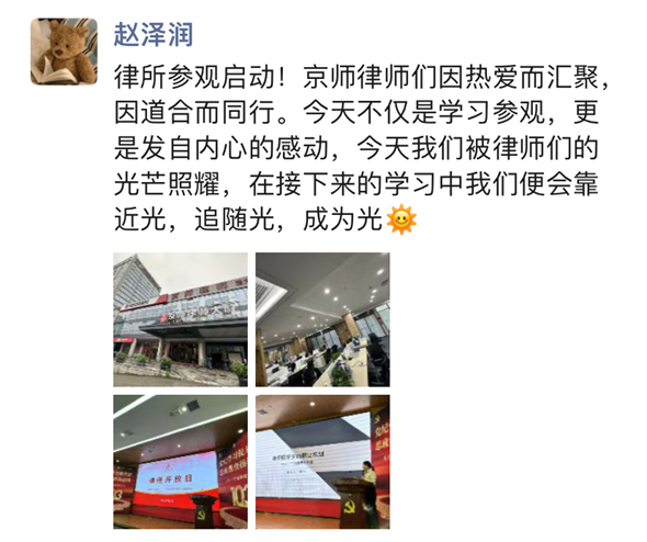 2023级的同学们,他们对法学相关知识已经有了基本的认识,但对于未来就业方向和奋斗目标仍存在许多困惑,本次律所参访活动恰逢其时。参访活动不但为同学们提供了就业方面的指导,也为同学们未来努力的方向提供指引,让同学们更加坚定了对法学学习的热爱和敬畏之心。很多同学深有感触,纷纷在朋友圈分享自己的心得体会。