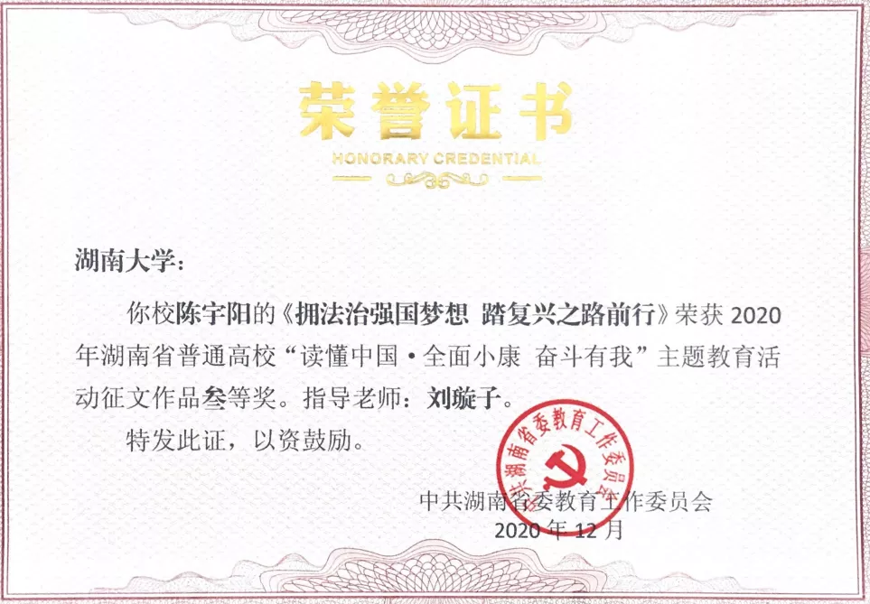 获评优秀组织奖,多位2018级本科生获不同级别奖项。1805班陈宇阳征文作品《拥法治强国梦想 踏复兴之路前行》获教育厅三等奖及香香漫画