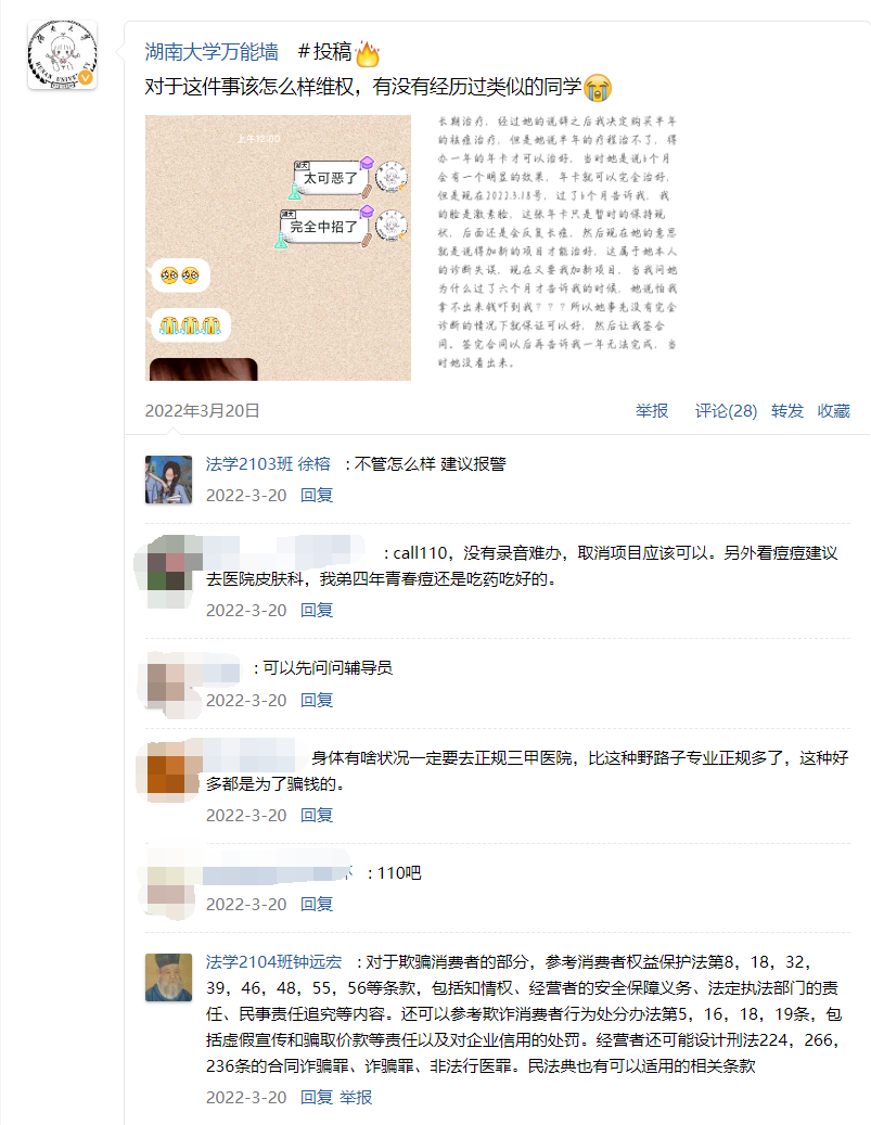 随着获赞数越来越高,我意识到大家可能都对这方面问题保有关注,并对用法律手段解决纠纷持有一个积极的态度。因此,我产生了联系当事同学并帮助她解决问题的想法,因为担心自己的专业知识可能不足以支撑对事件的掌握,一开始我有所犹豫,但我最后还是做出联系当事同学的决定,因为在大一刚刚步入法学之门的时,有位老师告诉我:法学是一门实践性极强的学科。只在理论中畅游是学不好法律的。