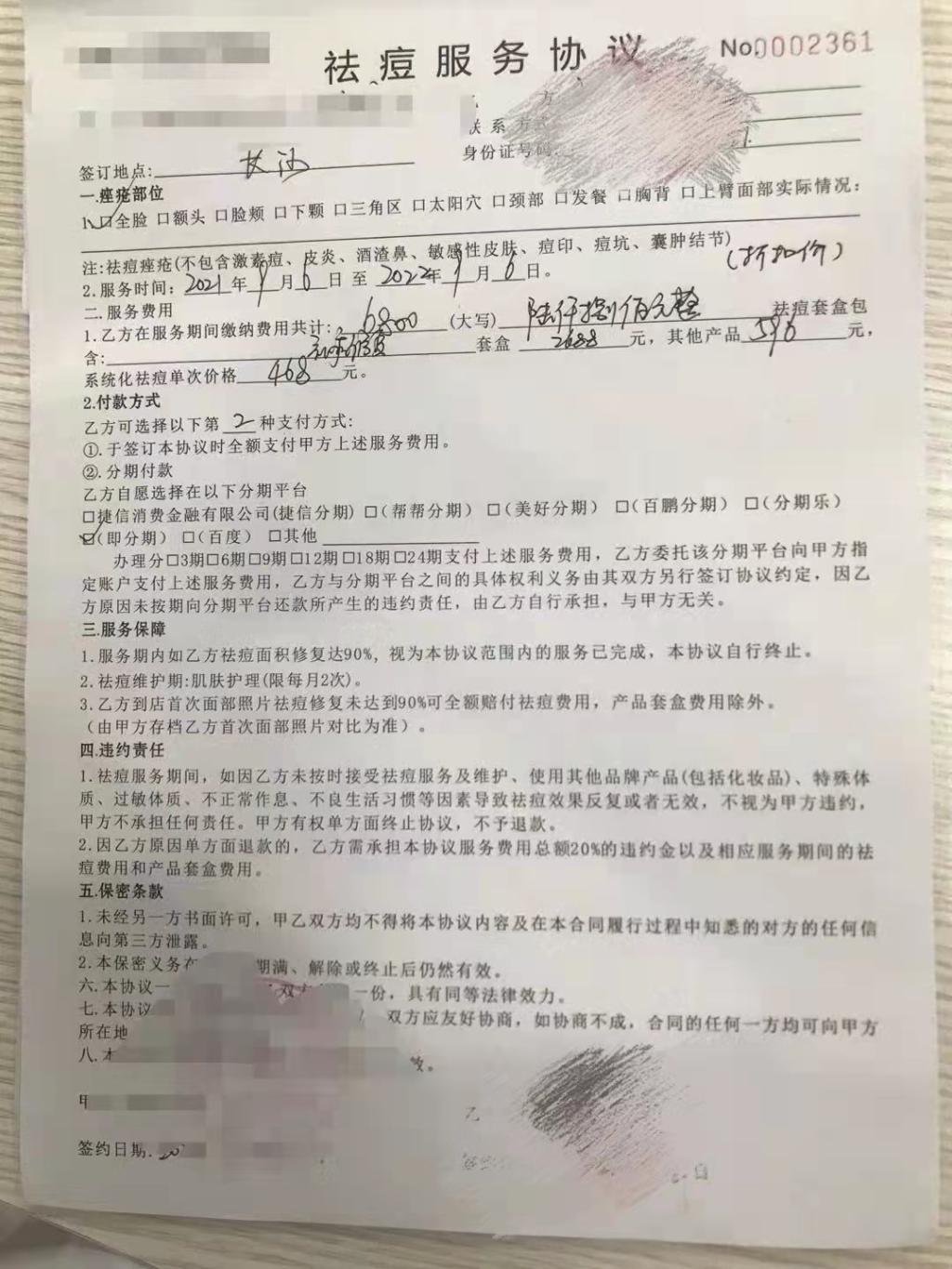 事件起于2021年9月5日,当事同学在美团上购买了长沙痘院士大学城店价值28元的无针祛痘,但到线下店中,被店长告知,脸比较严重需要长期治疗。当事同学遂听取店长的说辞,决定购买半年的祛痘治疗项目。随后,店长又表示,6个月的治疗会有个明显的结果,但无法根治,需要办理年卡才能够完全治好。6个月后至2022年3月18日,当事同学又被店长告知,她的脸属于激素脸,年卡只能够暂时保持现状,后期会反复长痘,需要增加新项目。面对当事同学“为什么过了6个月才告知”的质疑,店长解释道:是害怕当事同学会因诊断受到惊吓且担心当事同学无法足额付款。过后,得知当事同学无法一次性支付费用时,店长提供了一个二维码供当事同学扫码并指导当事同学在“即分期”APP上分期付款,店长特别提醒当事同学选择“社会人士”身份,而非“学生”身份。事后,当事同学发现原本仅需偿还的6800元,增加至8616元,当她提出想要终止合同时,遭到店长拒绝。至此,当事同学发现受骗。