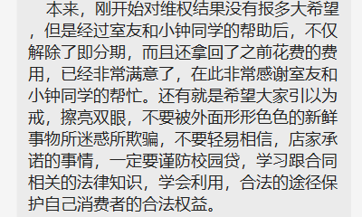 本来,刚开始对维权结果没有报多大希望但是经过室友和小钟同学的帮助后,不仅解除了即分期,而且还拿回了之前花费的费用,已经非常满意了,在此非常感谢室友和小钟同学的帮忙。还有就是希望大家引以为戒,擦亮双眼,不要被外面形形色色的新鲜事物所迷惑所欺骗,不要轻易相信,店家承诺的事情,一定要谨防校园贷,学习跟合同相关的法律知识,学会利用,合法的途径保护自己作为消费者的合法权益。