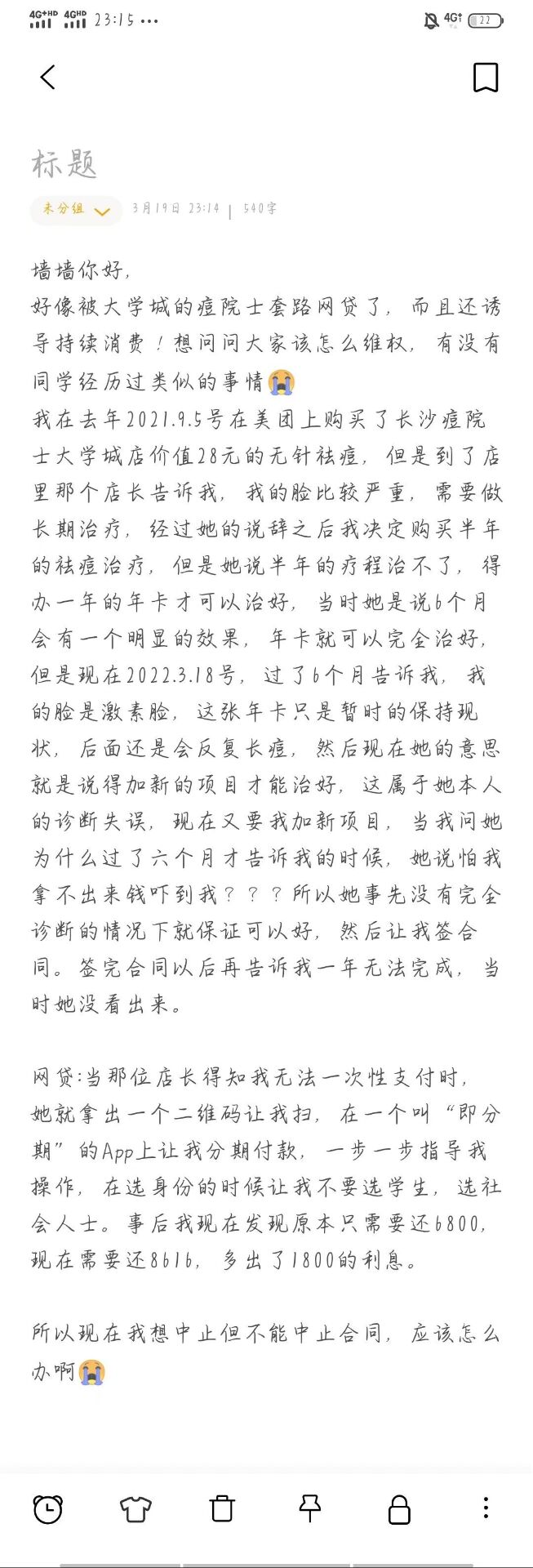 听完当事同学的诉说之后,发现她的确被商家的套路框住了。在签订合同之前,商家方的万般保证,在发现“激素脸”的事实之后,隐瞒不告诉,而继续若无其事的帮当事同学“治疗”。直到合同履行过半,商家才告知当事同学,无法继续治疗,除非另外增加新项目......