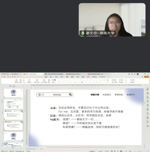 谢文欣同学指出保研需要具备的条件有拿到保研名额、拥有丰富的自身背景履历和信息收集能力,强调要不忘初心,放平心态。在文书准备方面,她提出要善于搜索并灵活化运用模板,可以有个人风格。在英文面试中,她建议在自我介绍中提前打好草稿并且背明白,有利于自如、流畅表达。最后,她鼓励大家迷茫时不要担心,放心大胆发问。