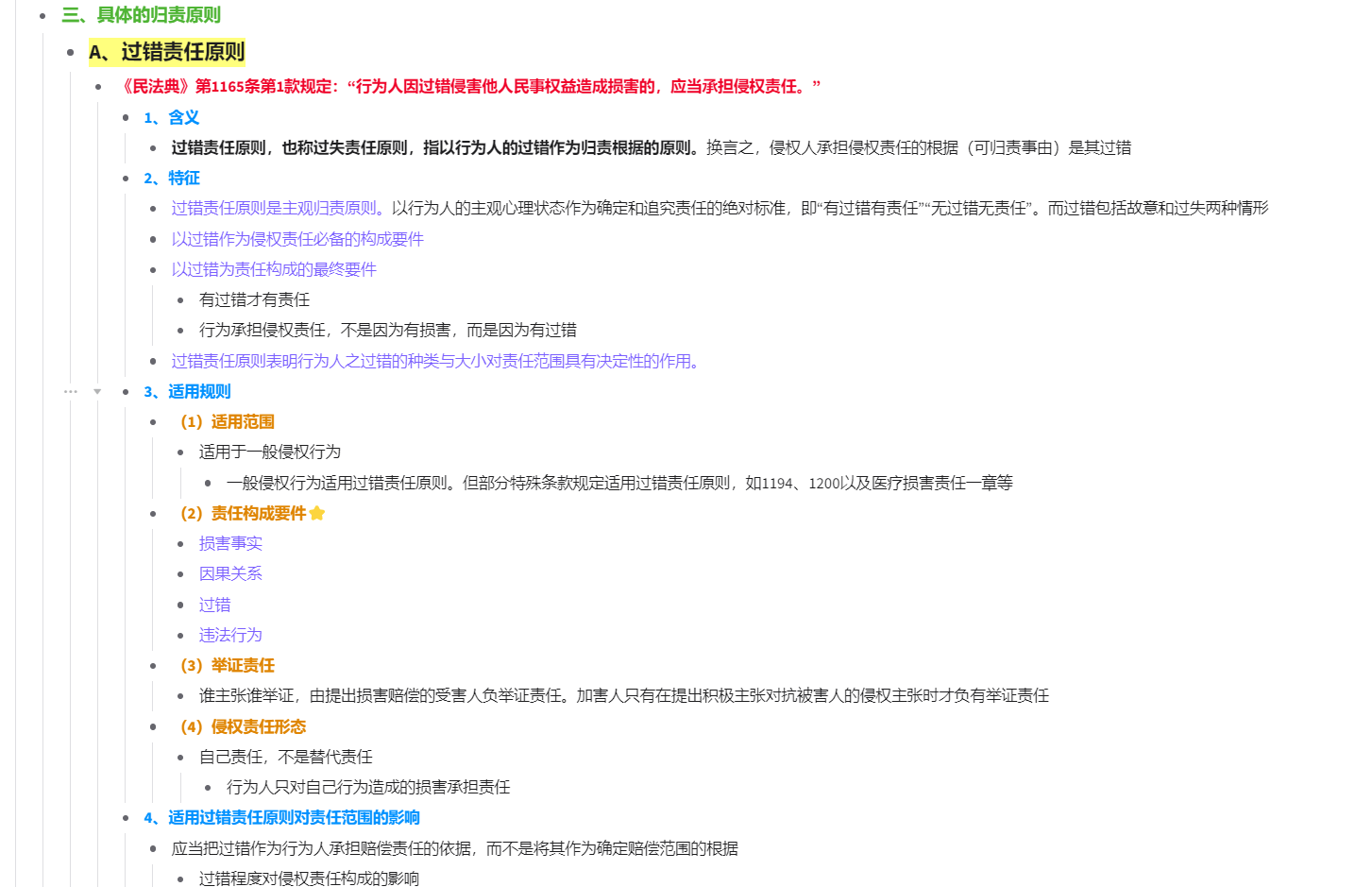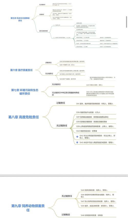 赵奕婷:首先,个人认为侵权责任法的记笔记的方式以及考试要求的核心在于明确自身所采用的知识体系,并在此基础上简明严谨地展开对问题的讨论。其次,建议整理笔记时深挖学习中遇到的细节、辩证思考每一个法条,特别是旧《侵权责任法》和《民法典》、特殊法和一般法之间的关系以及修改变动。本课中法条的重要性和优先级极高,建议通过笔记大致复述《民法典》侵权责任编的每一条法条,并理解其背后的立法意旨与制度价值。最后建议在笔记中明确区分相关的或易混淆的概念,比如致害和受害、不同群体、不同侵权归责原则、侵权行为方式、侵权责任方式、侵权责任形态(个人建议通过思维导图来进行体系化的梳理)。
