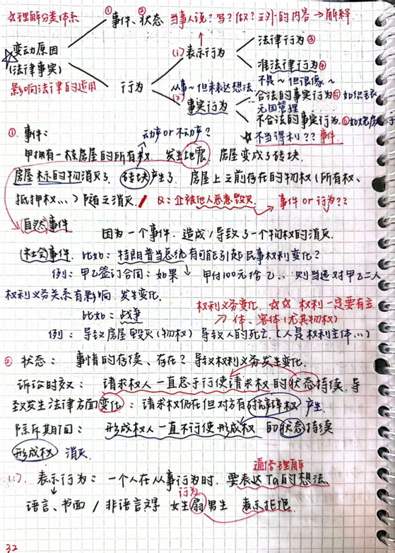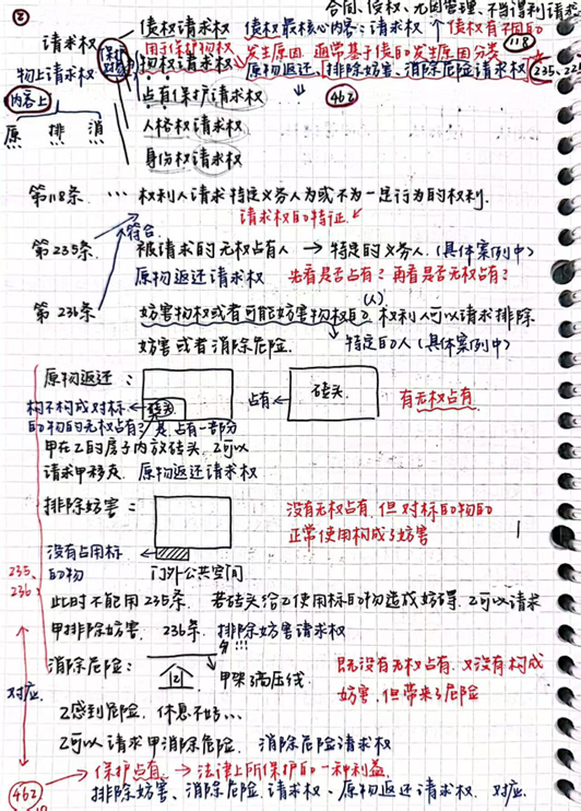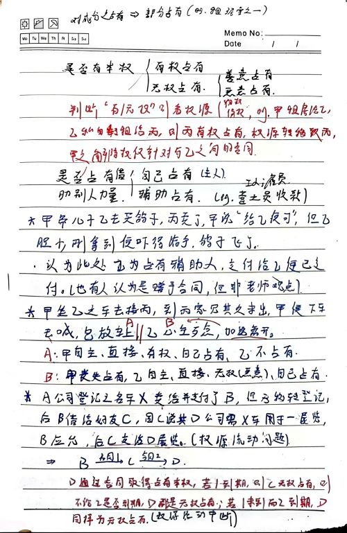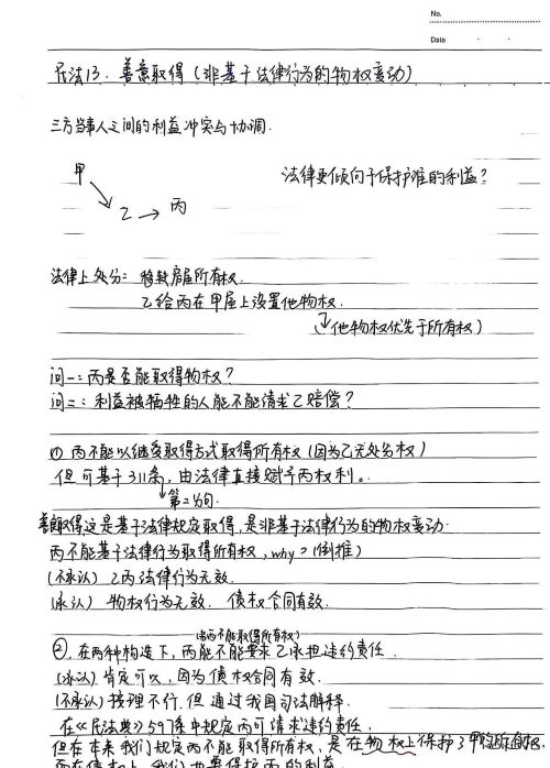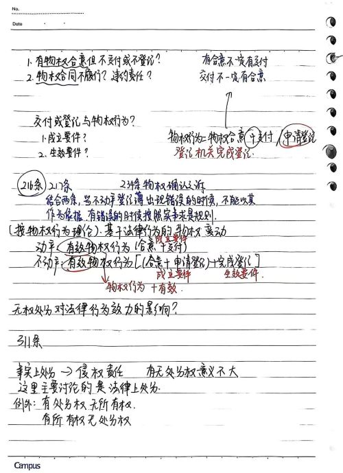 赵奕婷:个人觉得在记物权法的笔记时要精准吃透老师课堂所讲内容,做好民法总论与物权法的衔接。首先可以在笔记中体现老师上课所建构的思维模式与问题分析方式,如请求权基础规范分析方法。其次,建议使用能够同时支持手绘图功能和打字的笔记软件做笔记,因为物权法的学习中经常会有绘制人物关系图的场景,单凭打字很难快速且具象化地完成绘制。此外,个人建议以复习为导向记笔记,既便于复习时背诵,也便于让AI根据笔记出题辅助复习。最后建议在笔记中体现法条的重要性,并结合思维导图对法条进行体系化的整理以及记忆。