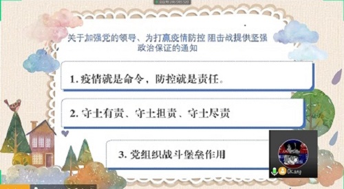 在班会第三环节,就疫情下个人防护的相关知识,同学们做了广泛交流。武汉籍同学通过分享自己的所见所闻和防疫经验,以亲身经历鼓励同学们坚定信心,同舟共济。近期,北京等地境外输入性病例激增,同学们纷纷表示,不获全胜绝不放松,将以更加饱满的热情投入到居家学习和防疫工作中,不虚度闭门在家的漫长假期,不辜负那些战斗在一线保万家平安的平凡英雄。