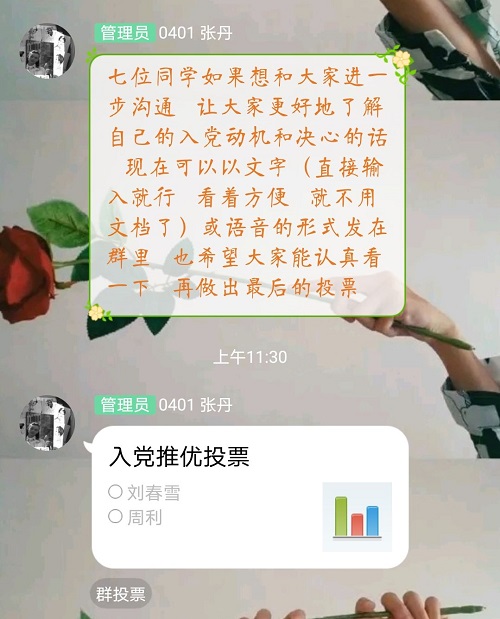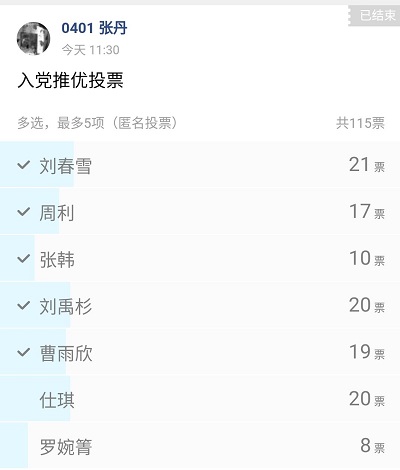 竞选发言结束后,团支书张丹同学利用社交平台组织匿名投票,以确保推选结果公平、公正、透明。到会同学认真聆听9位同学的发言,结合各位同学的平时表现,投出自己神圣的一票。根据最终统计票数结果,本次大会推选刘春雪、刘禹杉、周利、仕琪、曹雨欣同学为入党推优分子。