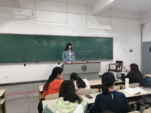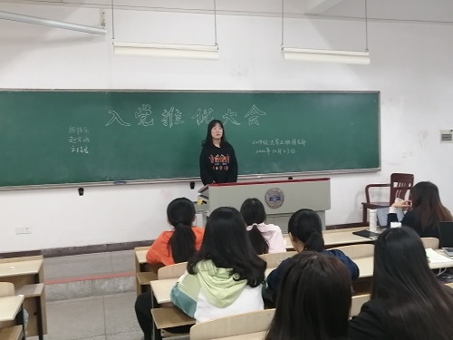 推优工作开始前,团支书李丹阳宣读入党推优的条件与推优流程,确保推选的公平公正。随后,陈佳乐,赵文涵,刘铭,李丹阳 ,何彦敏,王钰莹六位入党积极分子候选人依次上台发表竞选宣言。