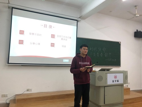 303教室举行以“担起时代使命,不负青春韶华”的主题班会。本次会议由班长罗华宇同学主持,法学1801班全体成员参加会议。