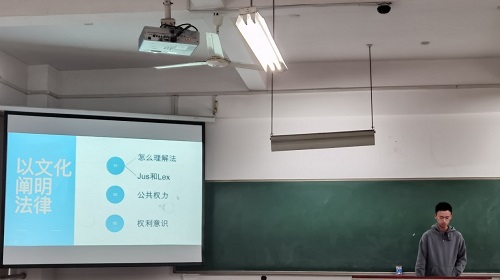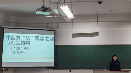 三位同学演讲完毕后,台下响起掌声。主持人紧接着宣布进行第三环节——同学自由讨论。同学们都积极参与讨论,提出了自己的独到见解与疑惑之处。随后蒋海松老师点评了本次读书会,对同学们相对于上一次读书会的进步表示了赞扬,对大家积极参与读书会的热情和学术态度给予了肯定。他提示大家更应注重中西国家起源的不同路径、血缘影响差异、社会结构差异等方面对中西法观念的影响。蒋老师对同学们提出的疑惑进行回答。有同学提问,“中西方都谈及法律与道德之结合,而为何效果截然不同”。蒋老师认为,中西方其实都有法律与道德结合的论述,法律与道德相容绝非中国的专利。但中西法律与道德之结合方式是相异的。中国古代将道德作为法律,即赋予了道德观念具有影响法律判决之“特权”,是一种较为直接的道德法律化。而西方更多是将道德通过特殊的法律技术“转化”进法律领域,黑格尔所谓道德“发挥”在法律里。相对而言,道德与法律的各得其宜,适度区分,使得其法律不再纯粹作为礼之工具,作为一种统治工具,法律间接表达道德关切,反而更有空间来承载权利、自由与正义的价值。我们法律人当然也关心道德问题,但主要关注的是具有法律意义的道德因素、在法律平台上检视道德因素,而非道德万能主义、道德中心主义。最后蒋老师又引用了《我不是药神》的现实案例与江歌刘鑫案的判决启示我们,“作为法学生要学会以法言法语去体现法律的温情,以法律技术去实现道德关怀!”