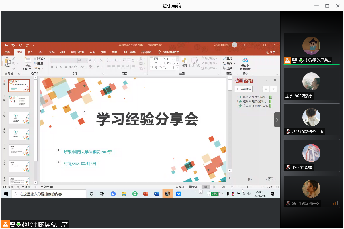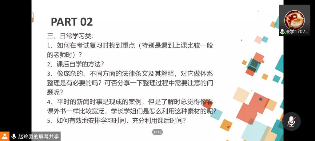 辞去小年,春节将至。2021年2月6日晚,为提高法学1902班同学的学习能力,解决同学们在学业上的困惑,张晓勇老师协调五位优秀的保研学子向大家分享宝贵的学习经验。张莹、张键、张亚培和金矗同学参与线上会议。陆艺敏学姐虽因事未能到场,但悉心地将经验整理成文档,分享给同学们。