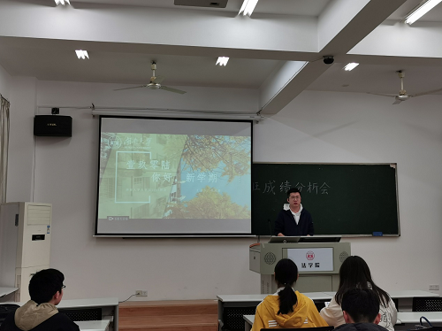 会议开始,班长张致豪对上学期的班级成绩进行总结汇报。张致豪将总体情况概括为“零挂科人数可圈可点、乏拔尖同学值得重视”,并逐一分析各门课程的平均分、高分层、低分层的状况。