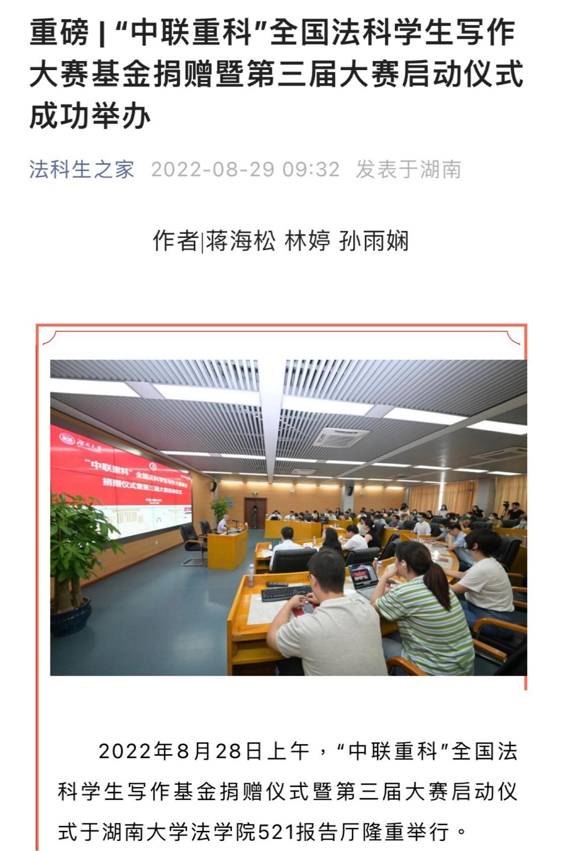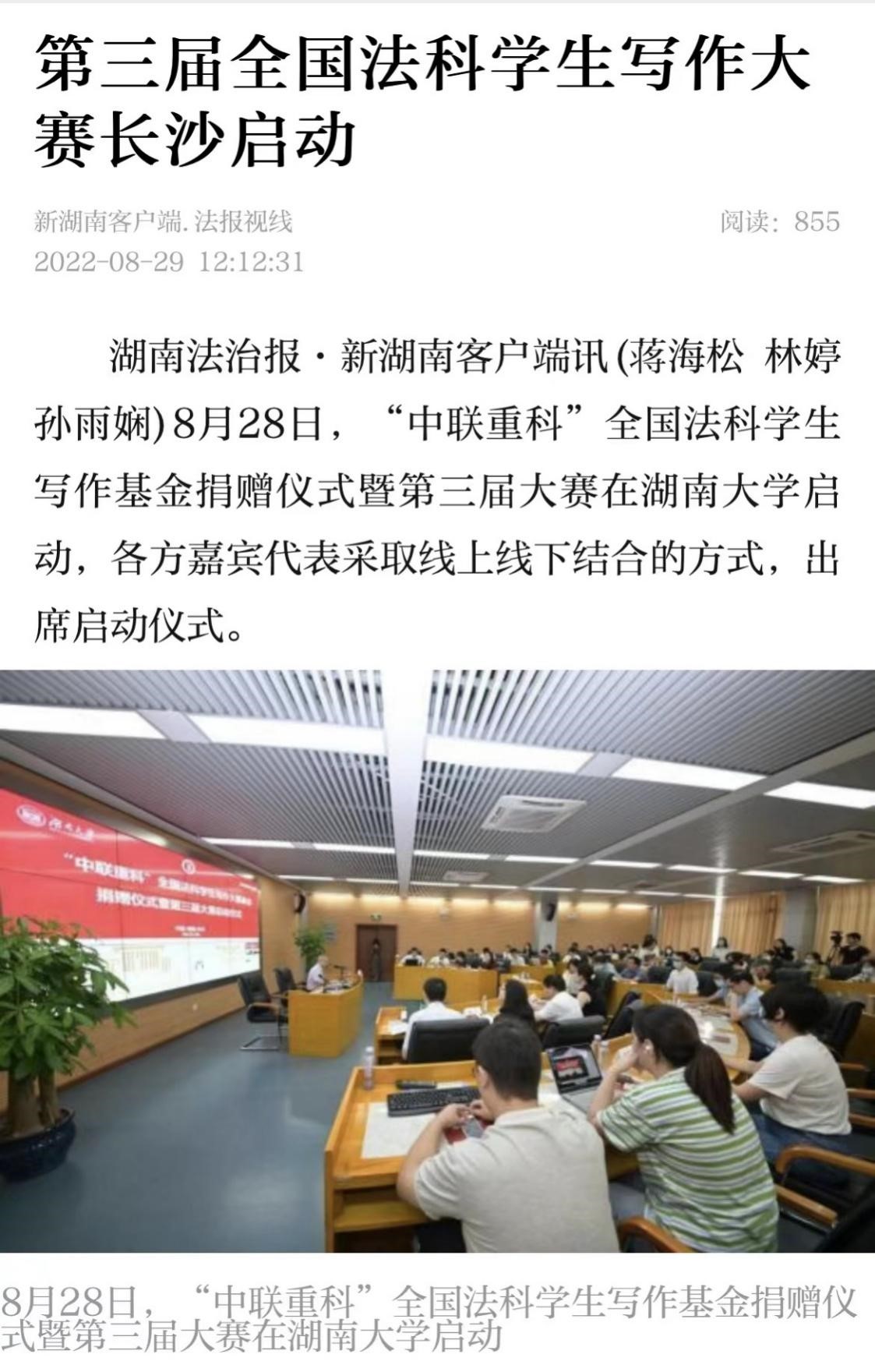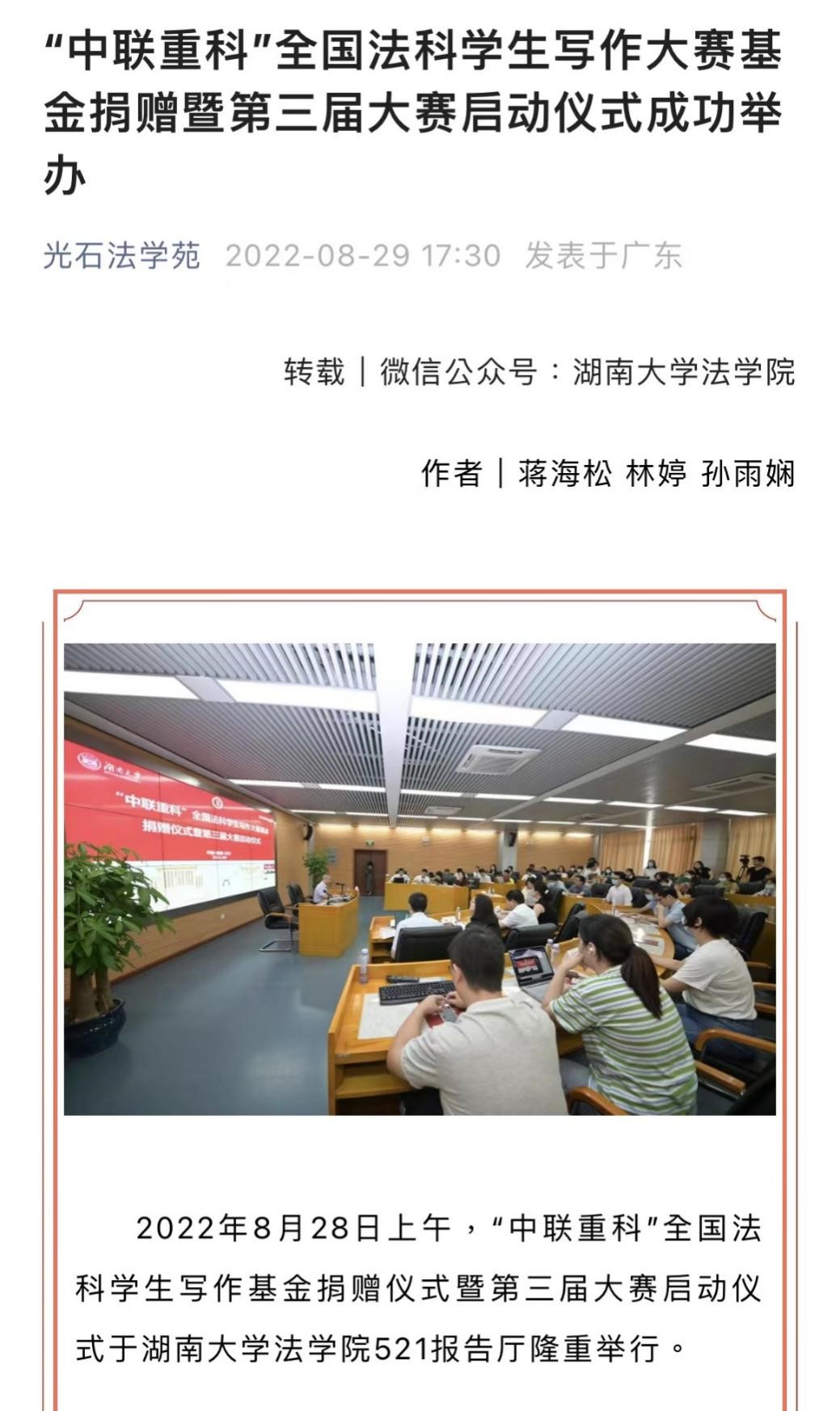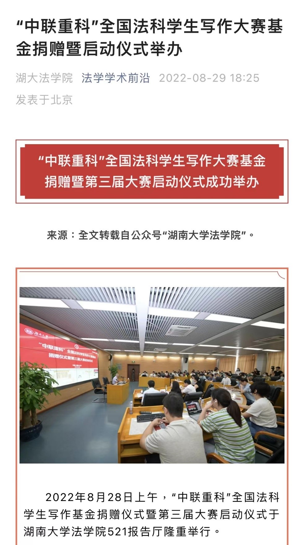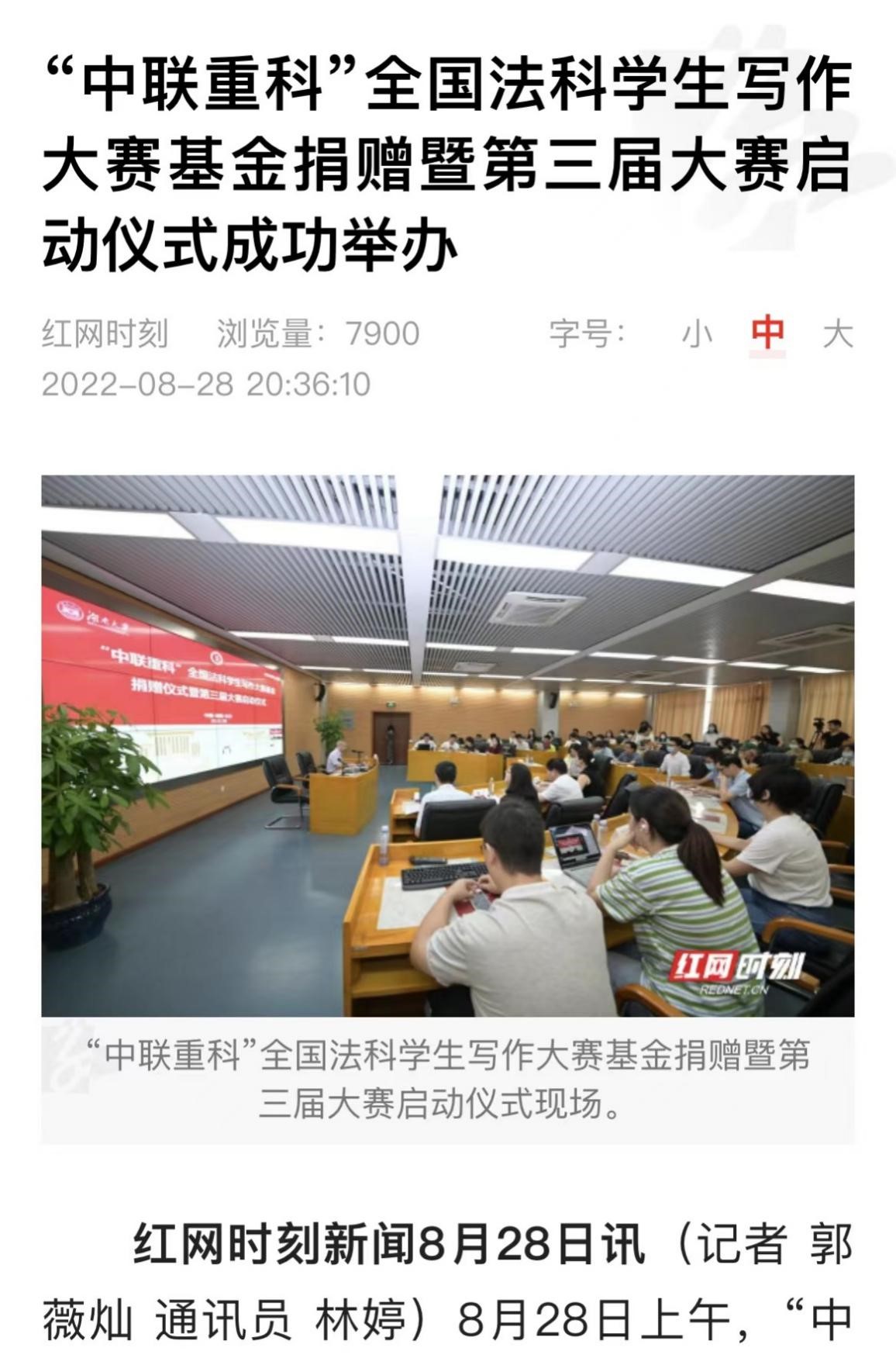 2022年8月28日上午,“中联重科”全国法科学生写作基金捐赠仪式暨第三届大赛启动仪式于香香漫画