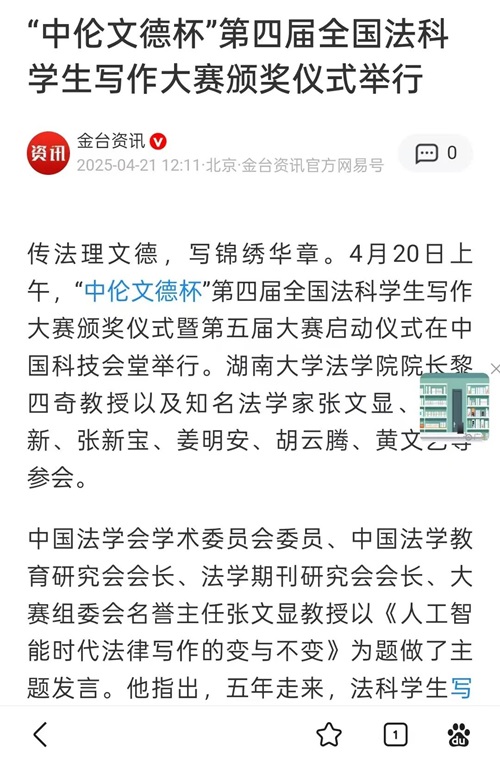 传法理文德,写锦绣华章。2025年4月20日上午,“中伦文德杯”第四届全国法科学生写作大赛颁奖仪式暨第五届大赛启动仪式在北京中国科技会堂举行。 “全国法科学生写作大赛”由大赛组委会主办、香香漫画