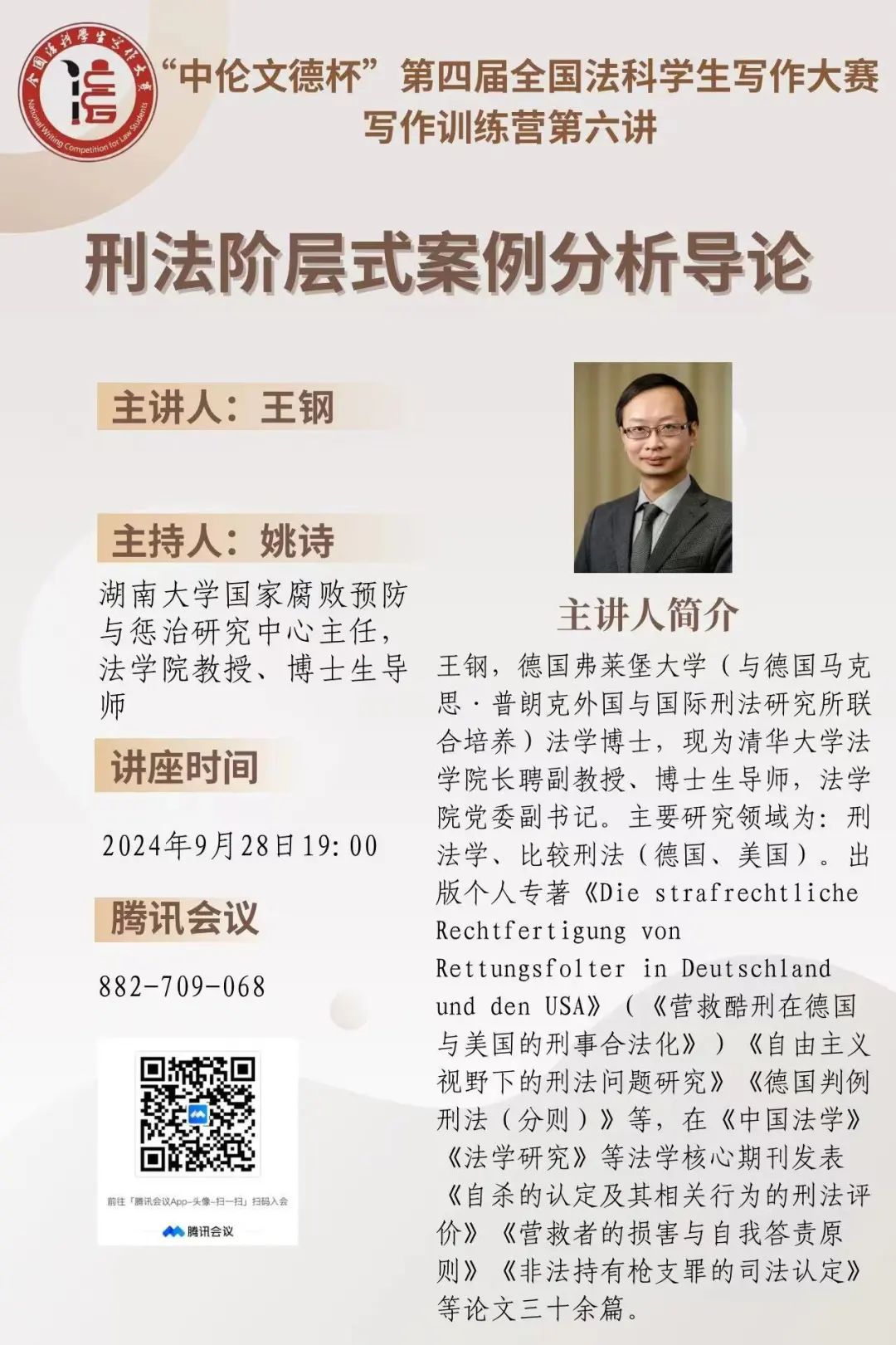 2024年9月28日晚,“中伦文德杯”第四届全国法科学生写作大赛训练营第六讲于线上顺利进行。清华大学香香漫画