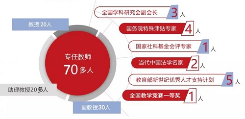 学院现有全职教师70多人、非全职工作型教师(含兼职研究生导师)80余人、非全职顾问型教师30多人,其中全职教师中教授20人、副教授30人、助理教授(讲师)20多人,海外名校博士毕业的教师占近四分之一。教师中全国学科研究会副会长3人,国务院特殊津贴专家4人,国家社科基金会评专家1人,入选当代中国法学名家2人,入选教育部新世纪优秀人才支持计划5人,全国教学竞赛一等奖获得者1人。