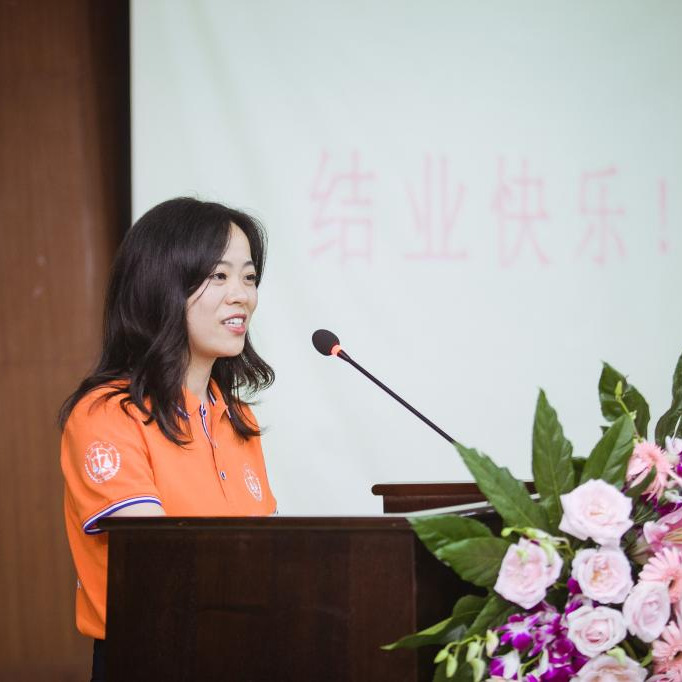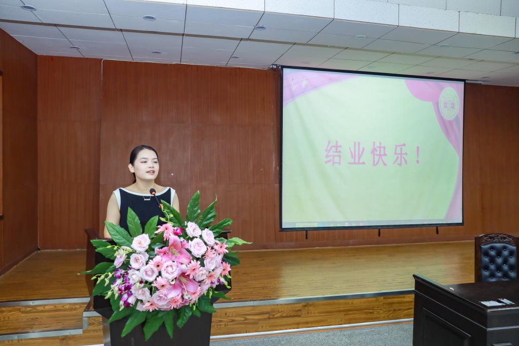随后,典礼第五项,张娜老师作为班主任代表发言。她提出作为班主任,两年的时光里近距离的感受到了大家因疫情耽搁,返校求学的热忱,同时也最真切的理解到作为在职人群潜心求学的艰辛与不易。两年的相处时光中收获了很多难忘的回忆,共同感受到了很多同学为集体发热的温暖瞬间、见证了同学为梦想拼搏的感动。希望同学们不断奋进,努力向前,不管何时,班主任一直都在,都将是大家最强大的后盾。