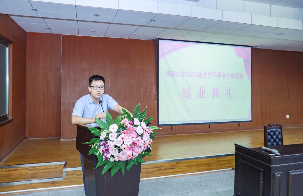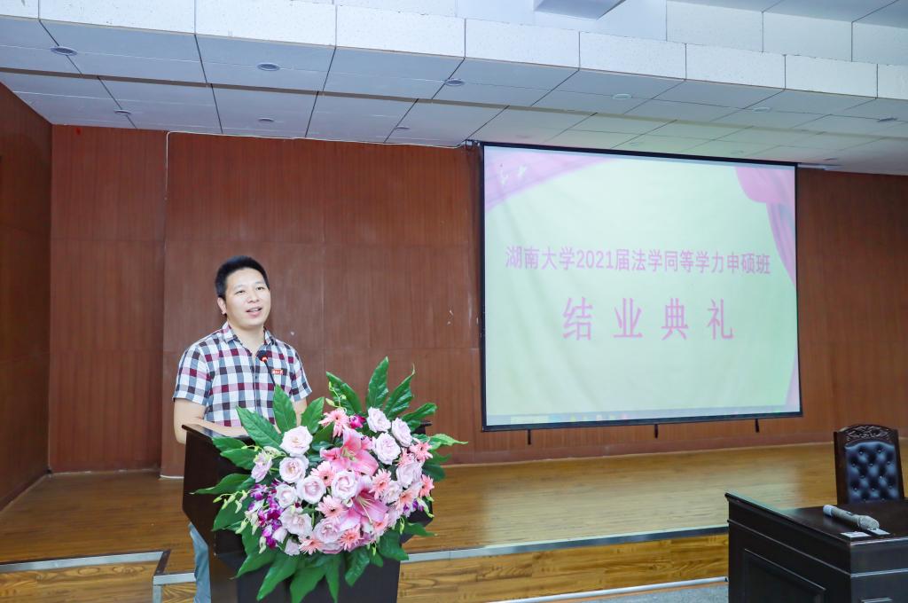 湛建云副院长随后致辞。他对在场每一届学生人数如数家珍,并给了所有结业同学一个大大的赞。他说道今年非常流行的一句话叫做“反内卷,去躺平”,大家有时确实会觉得生活艰辛,但是不妨把心态摆正,尽量减少焦虑。另外,他希望大家永远不要失去奋斗的目标,不管是否从事法律职业,永远保持有所追求。人生就似一列飞奔的列车,湖大求学只是其中的一个站点,结业也只是一个阶段。旅途还在继续,我们没有理由去放下心目中的梦想。最后,他祝愿大家有一个强健的身体,只有身体康健,一切才有意义,一切才皆有可能。