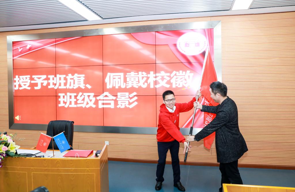 副院长湛建云亲自为22级法学申硕2班授予班旗,鲜红的班旗在学生代表手中挥舞。