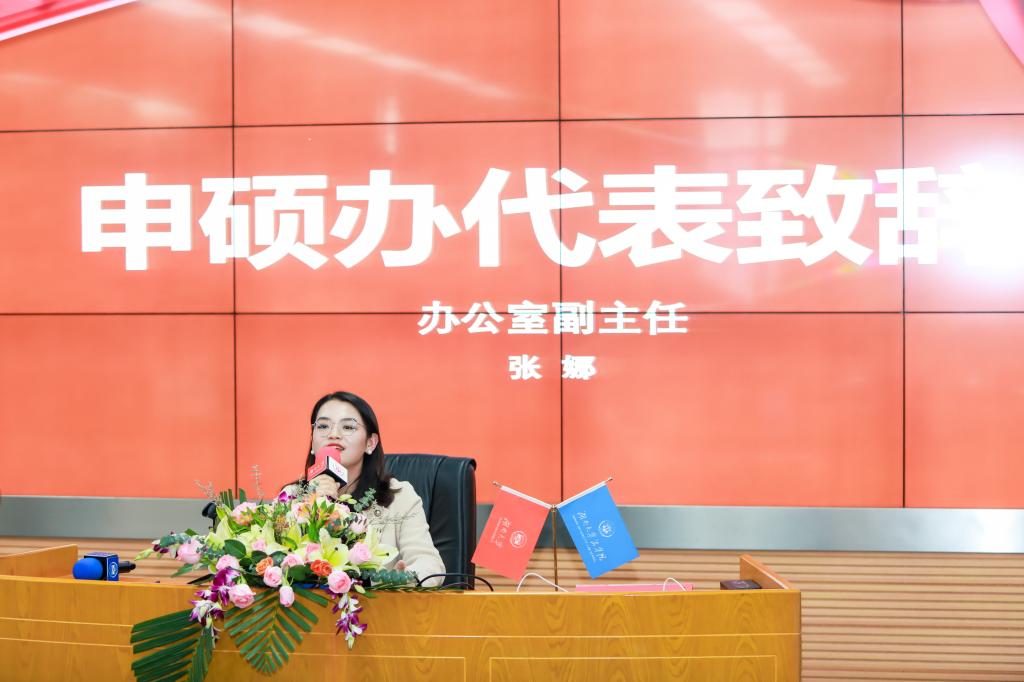 典礼第三项议程为申硕办副主任张娜致辞。张娜老师提出了在接下来的学习过程中对大家的几点期待。
